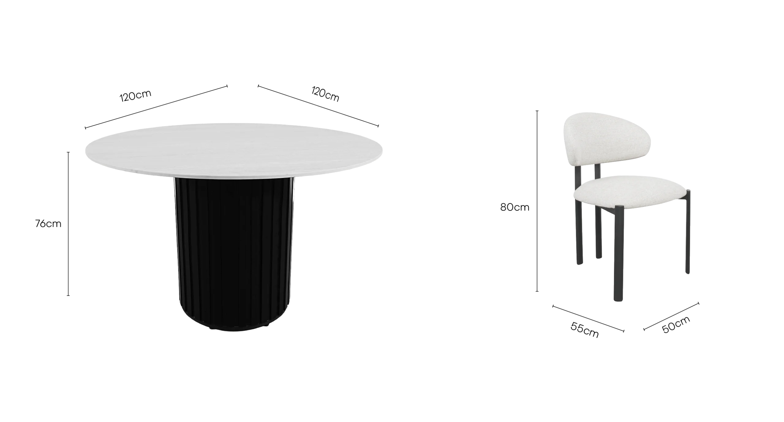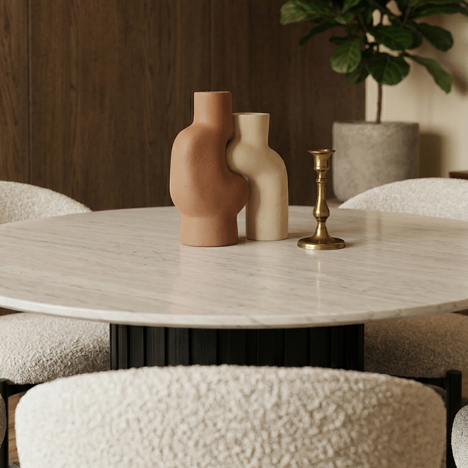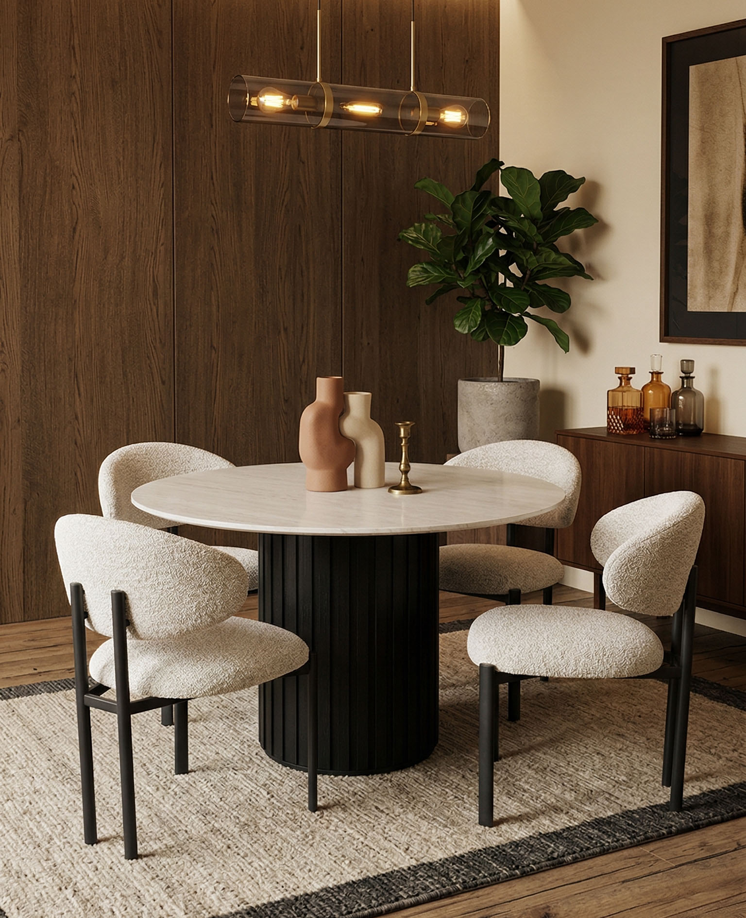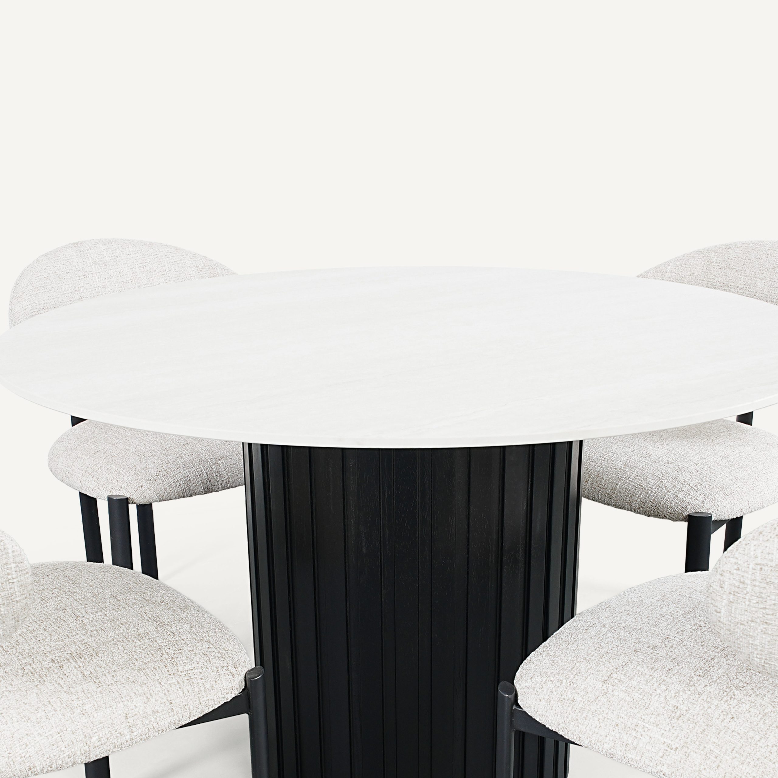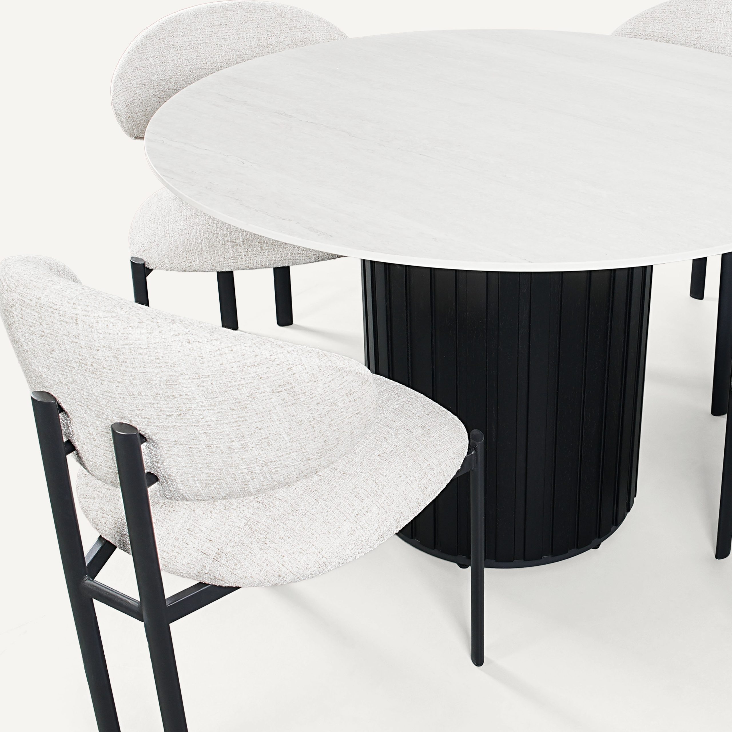A striking study in texture and high-contrast geometry. This ensemble pairs the bold, fluted architectural base of the Bowden table with the minimalist, wrap-around elegance of the Vivi chairs. The set creates a powerful focal point by balancing a heavy, grounded pedestal with a lightweight, skeletal seating arrangement.