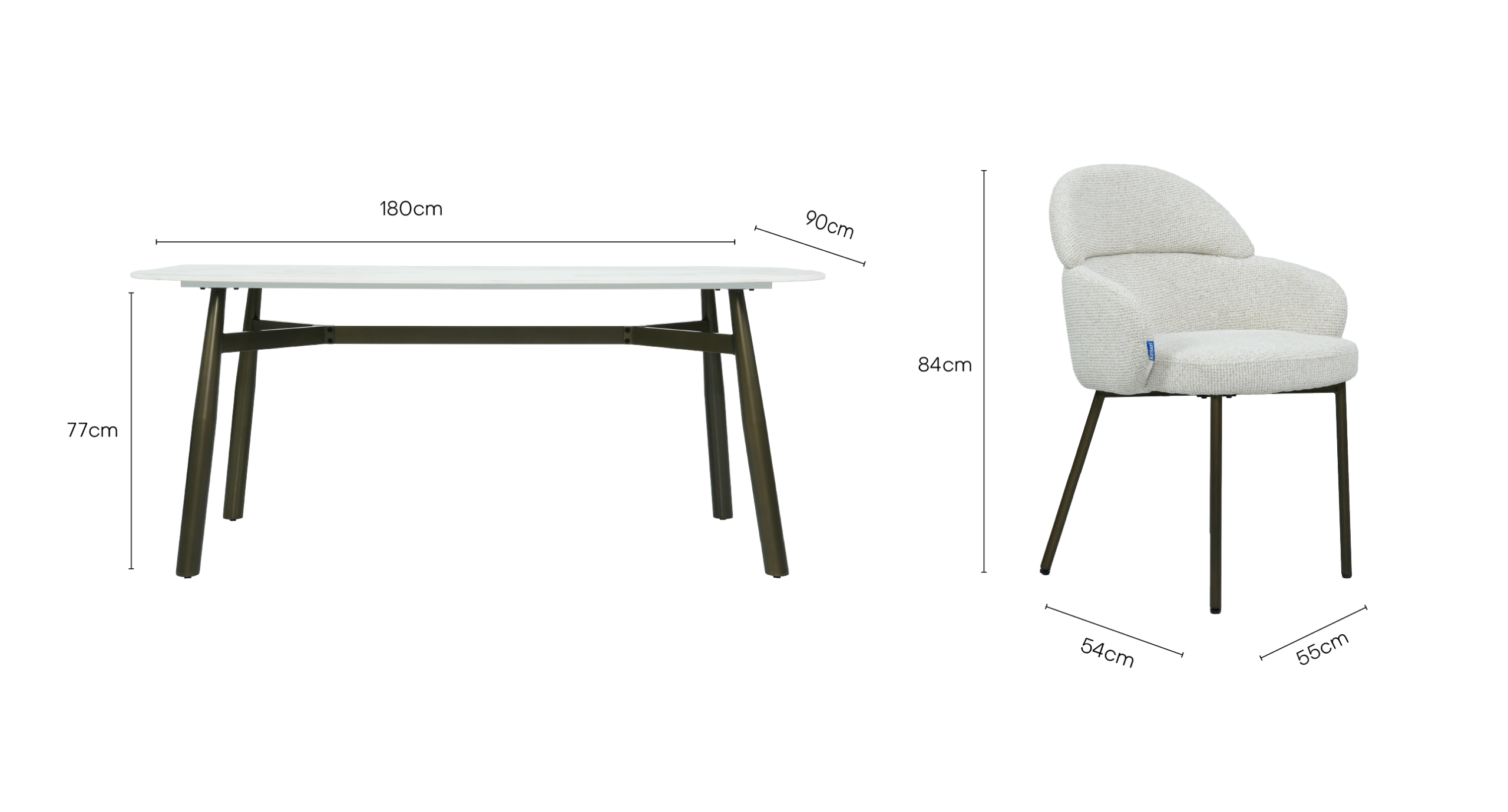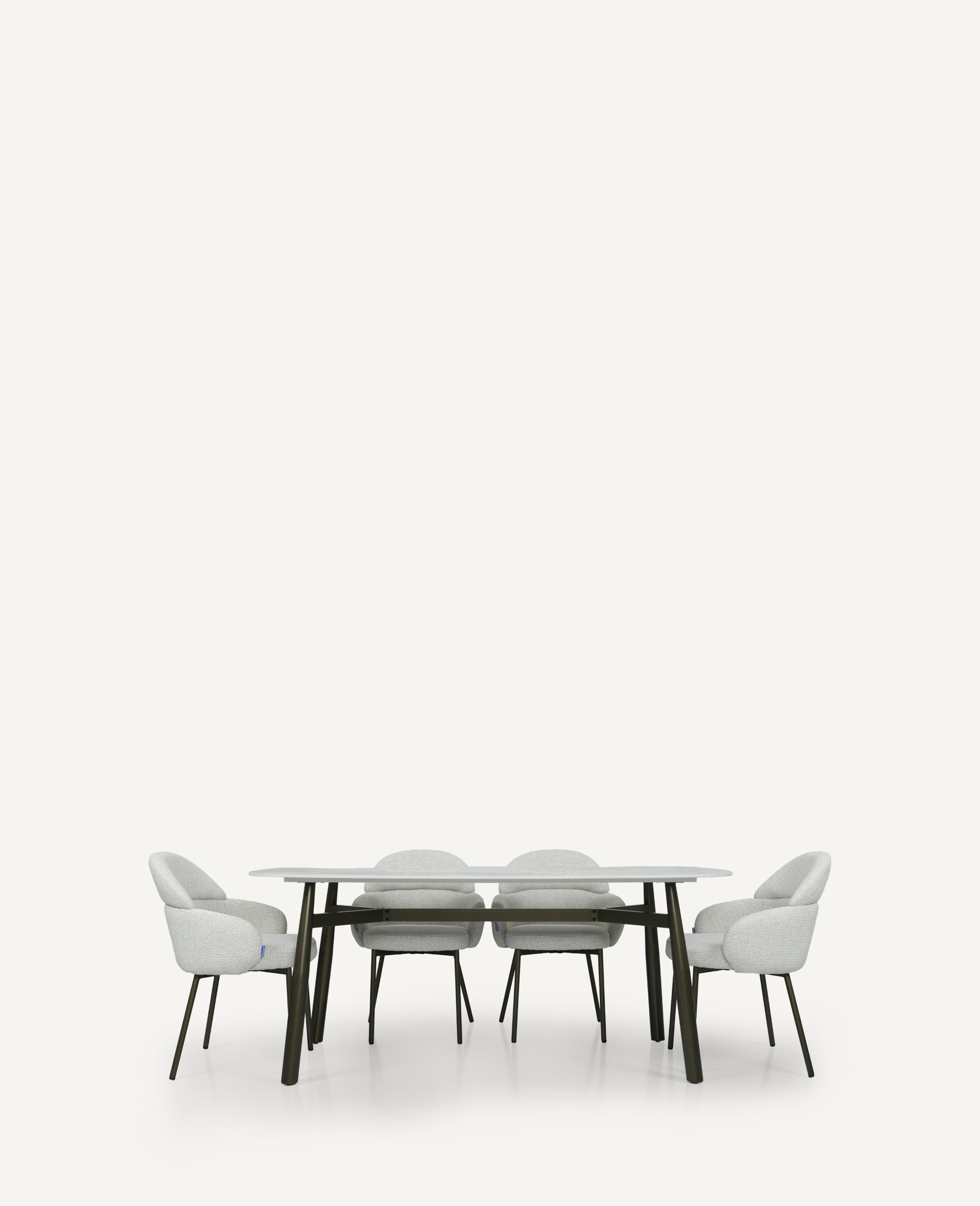 The Calia table and Romo chair unite durable sintered stone and certified upholstery with sleek epoxy steel detailing, offering a refined balance of sustainable luxury, everyday practicality, and lasting modern comfort.