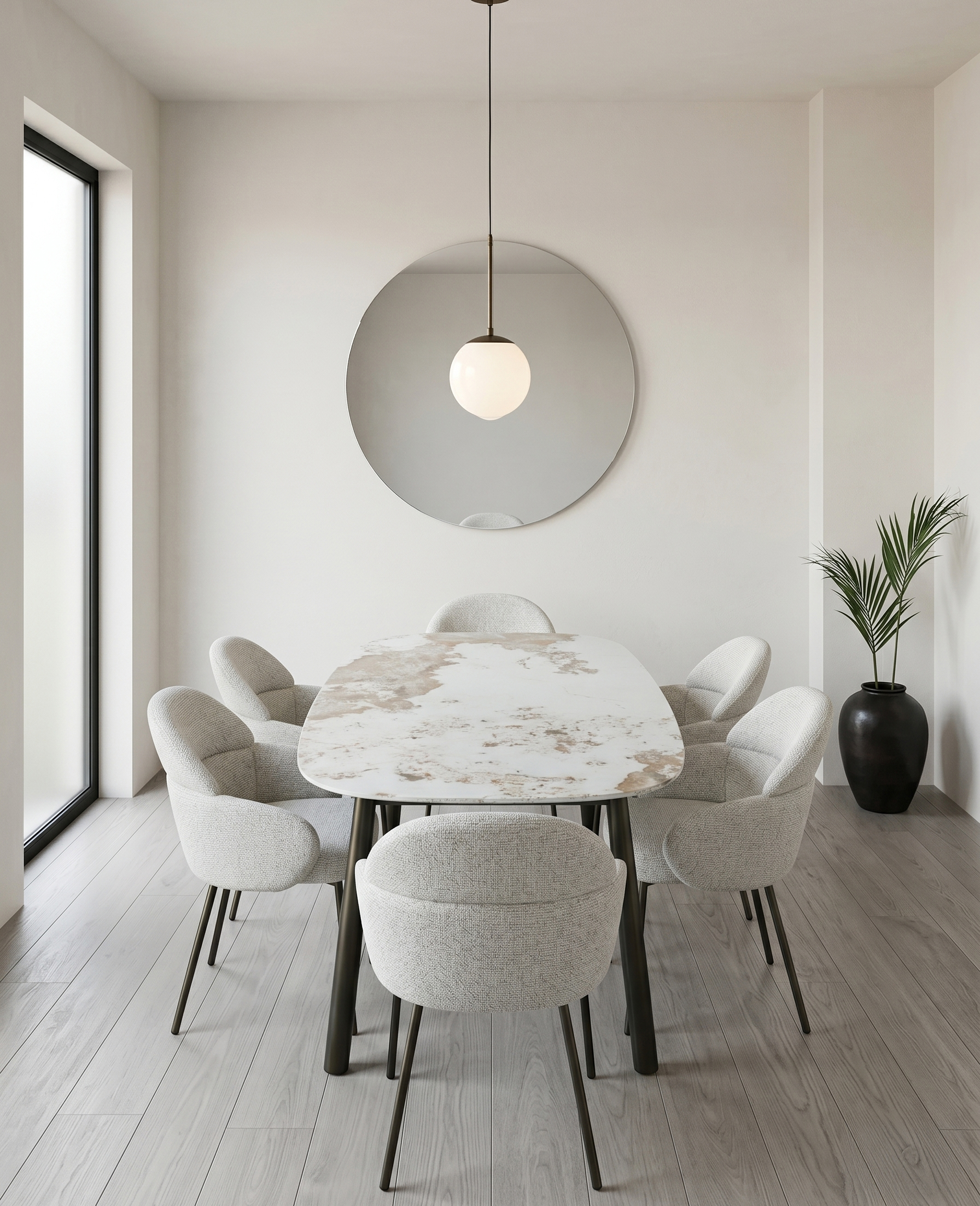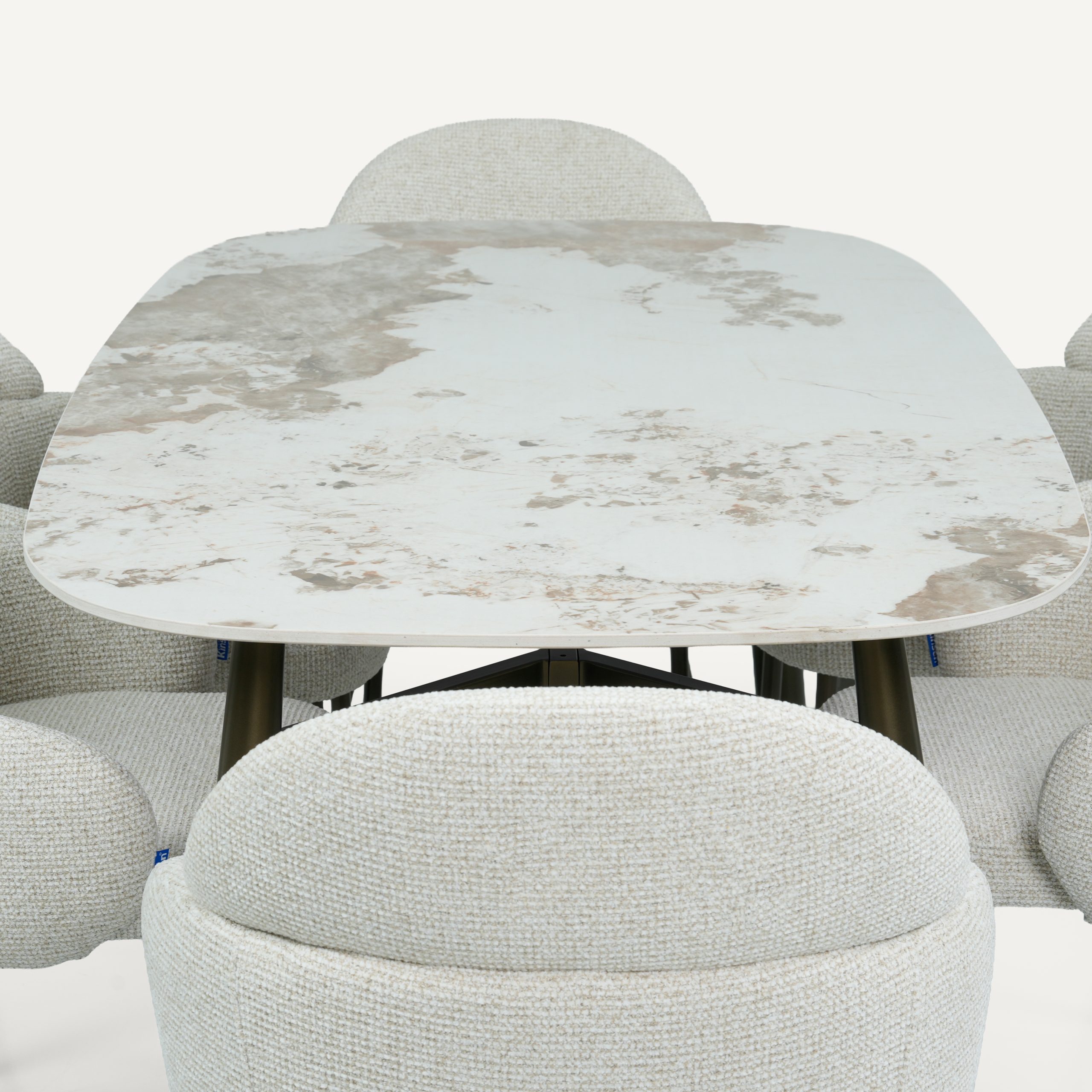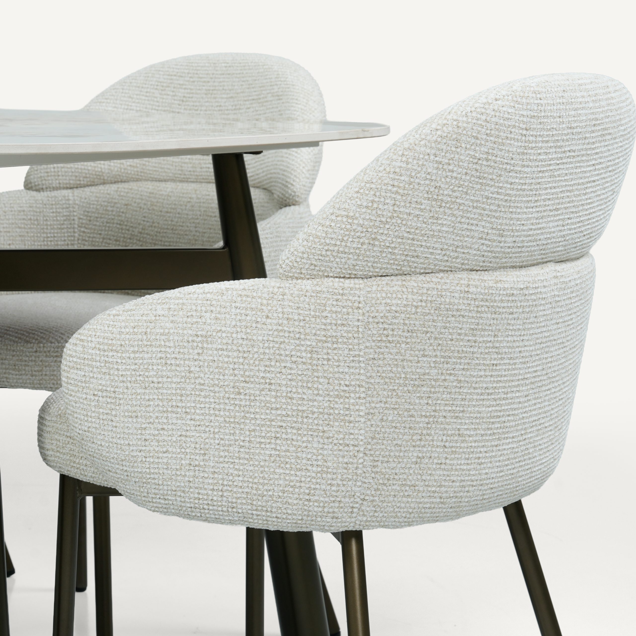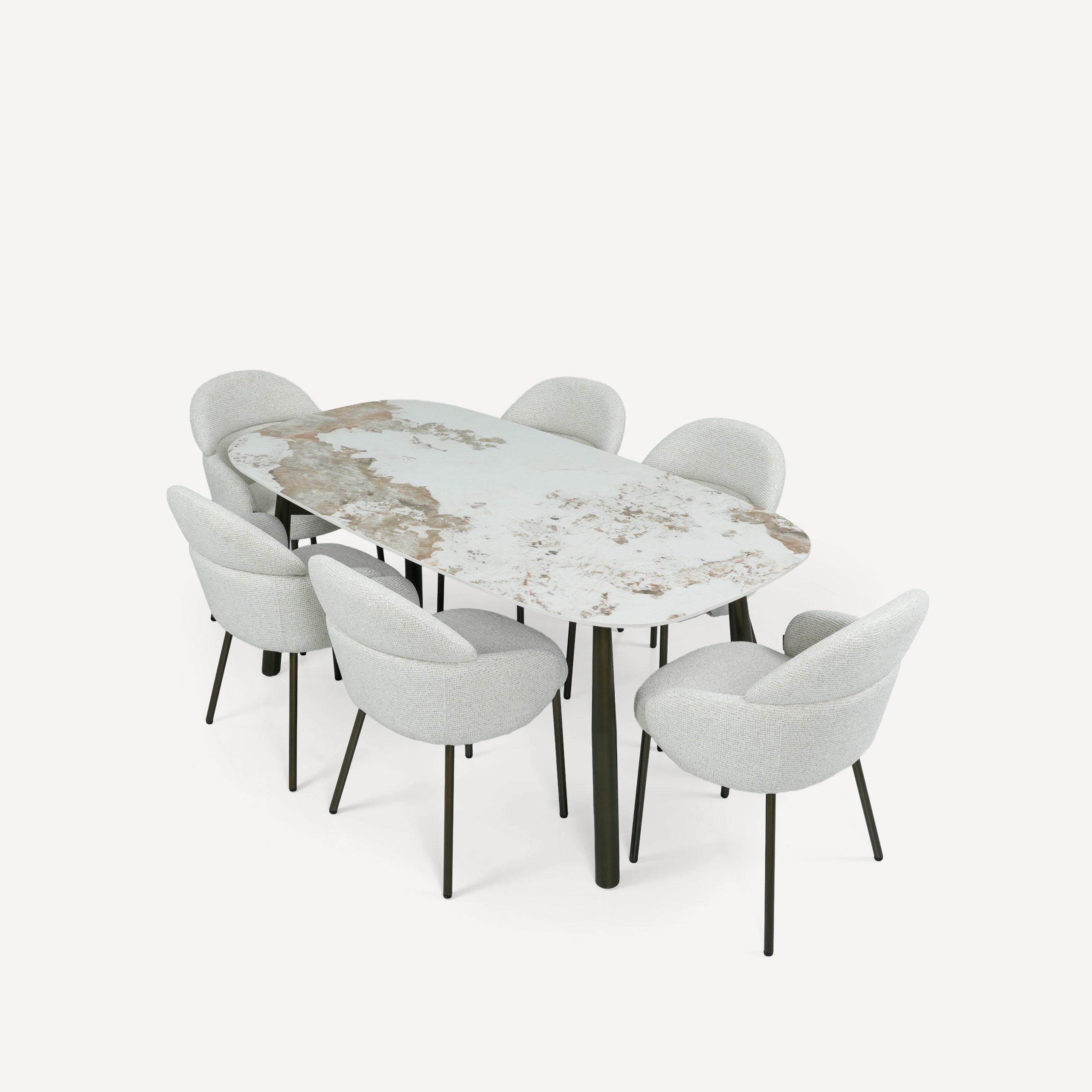 The Calia dining table and Romo chair embody a modern lifestyle concept where sustainable luxury meets everyday functionality. Designed for contemporary living, Calia features a sintered stone surface that captures the beauty of natural marble while delivering exceptional resistance to scratches, heat, and stains for effortless long-term use. Its sleek epoxy steel base reinforces a minimalist aesthetic with lasting structural strength. Complementing it, the Romo chair introduces sculptural comfort with OEKO-TEX® certified upholstery, ensuring a safe, eco-conscious, and soft-touch seating experience. Its ergonomic, wraparound form and plush cushioning are designed for extended comfort without compromising style. Anchored by durable epoxy steel legs, it brings stability and refined contrast to any space. Together, they represent a cohesive design philosophy of durability, wellness, and timeless modern elegance.
