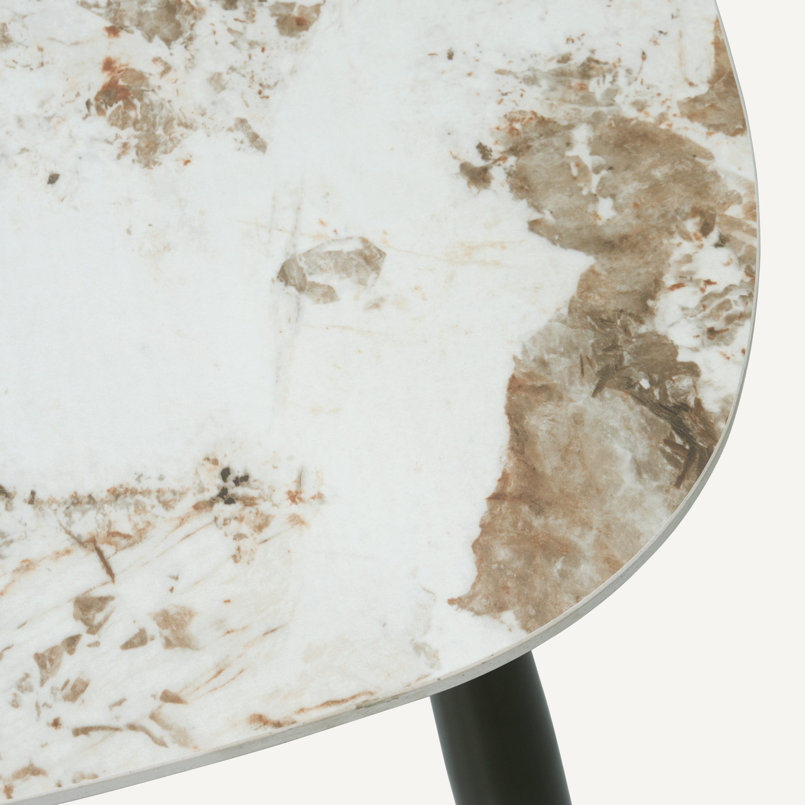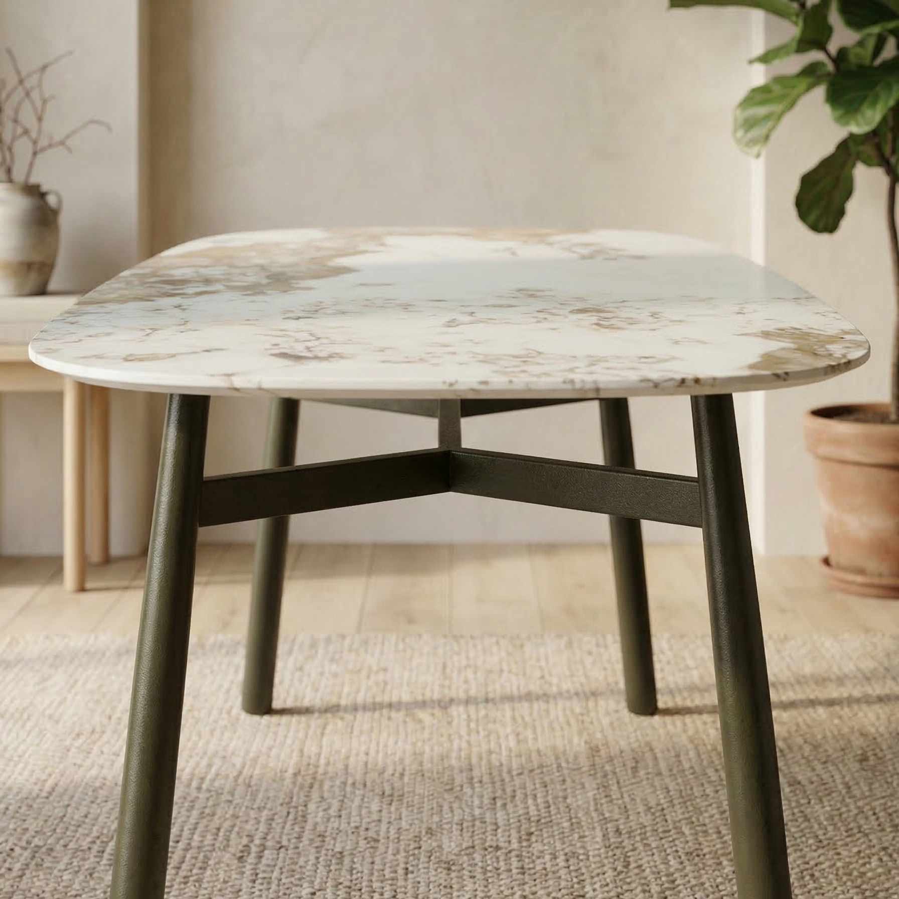 Elevate your dining room with the distinctive design of the Calia table. This piece features a beautifully weathered marble-inspired surface, offering a unique blend of earthy tones and crisp whites.