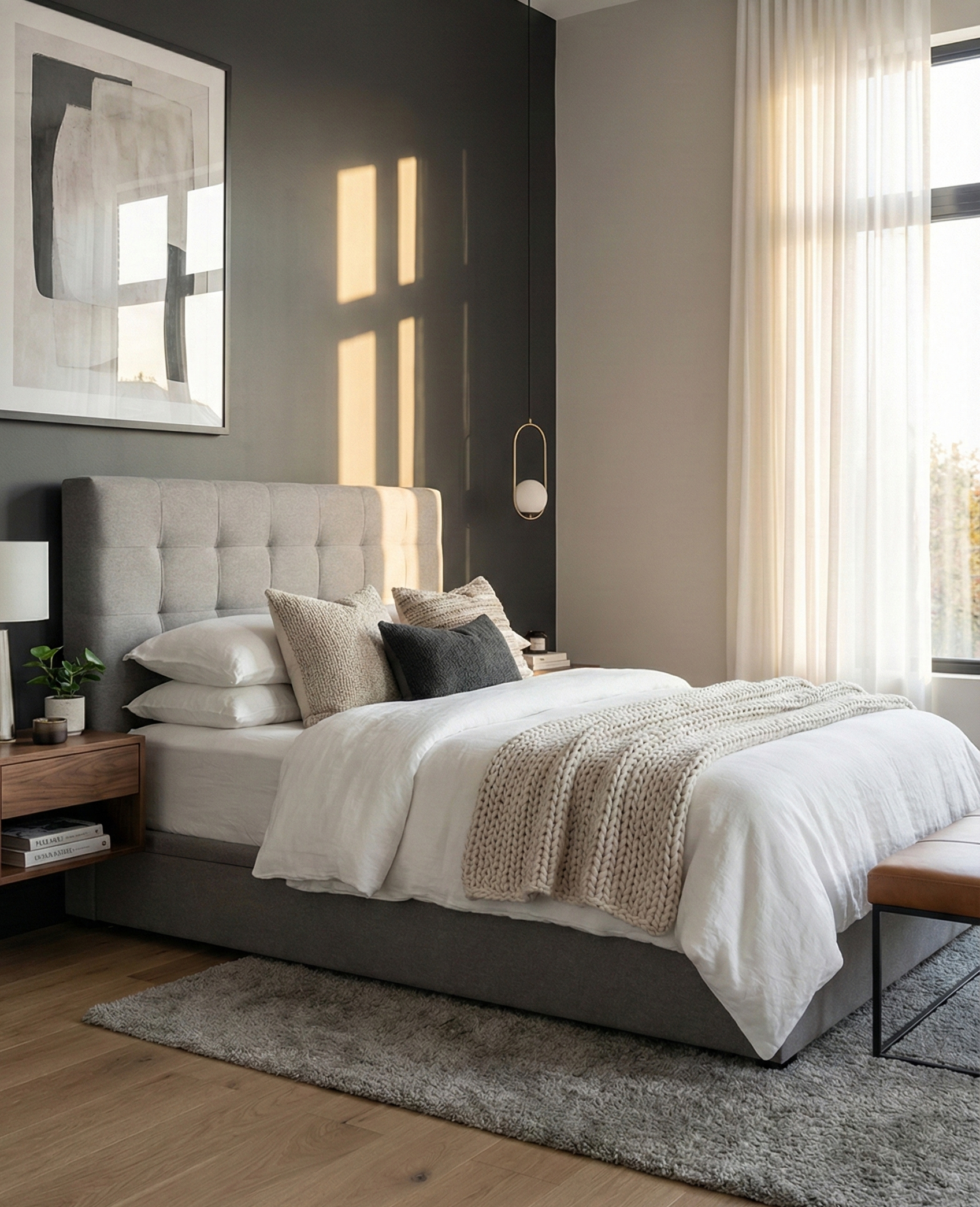 The Mado bed offers a sophisticated blend of contemporary design and inviting warmth, poised to be the elegant focal point of your bedroom. It features a striking oversized headboard with a unique vertical panel design and gently flared wingback sides, creating a refined silhouette that exudes both comfort and grandeur. Built for practical, healthy living, the entire bed is meticulously wrapped in premium, soft-touch fabric that is both OEKO-TEX® Certified, free from harmful chemicals and water-repellant performance treated for easy spill cleanup. Completed with a sturdy, fully upholstered platform base, the Mado bed ensures maximum mattress support while adding an air of understated luxury and peace of mind to your space.