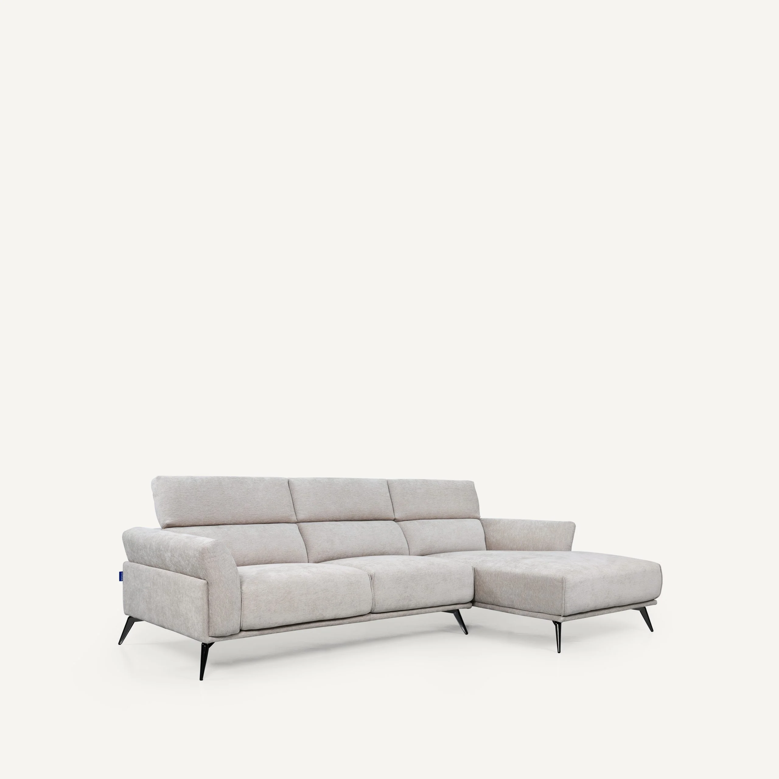 Frontino – A sleek, modern chaise sectional that epitomizes contemporary lounging. With its textured upholstery and striking architectural black legs, it offers a “floating” aesthetic that feels airy and sophisticated.