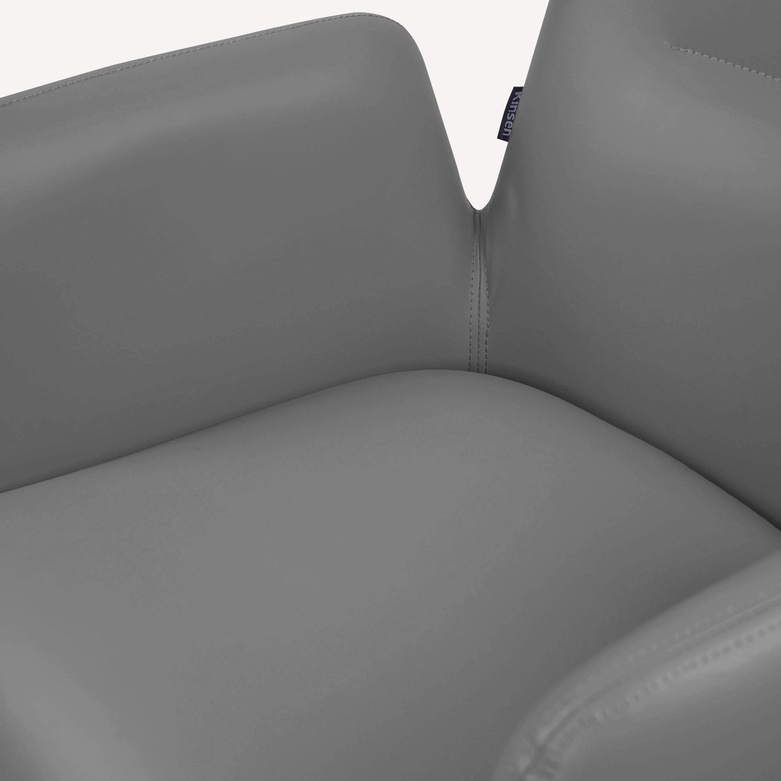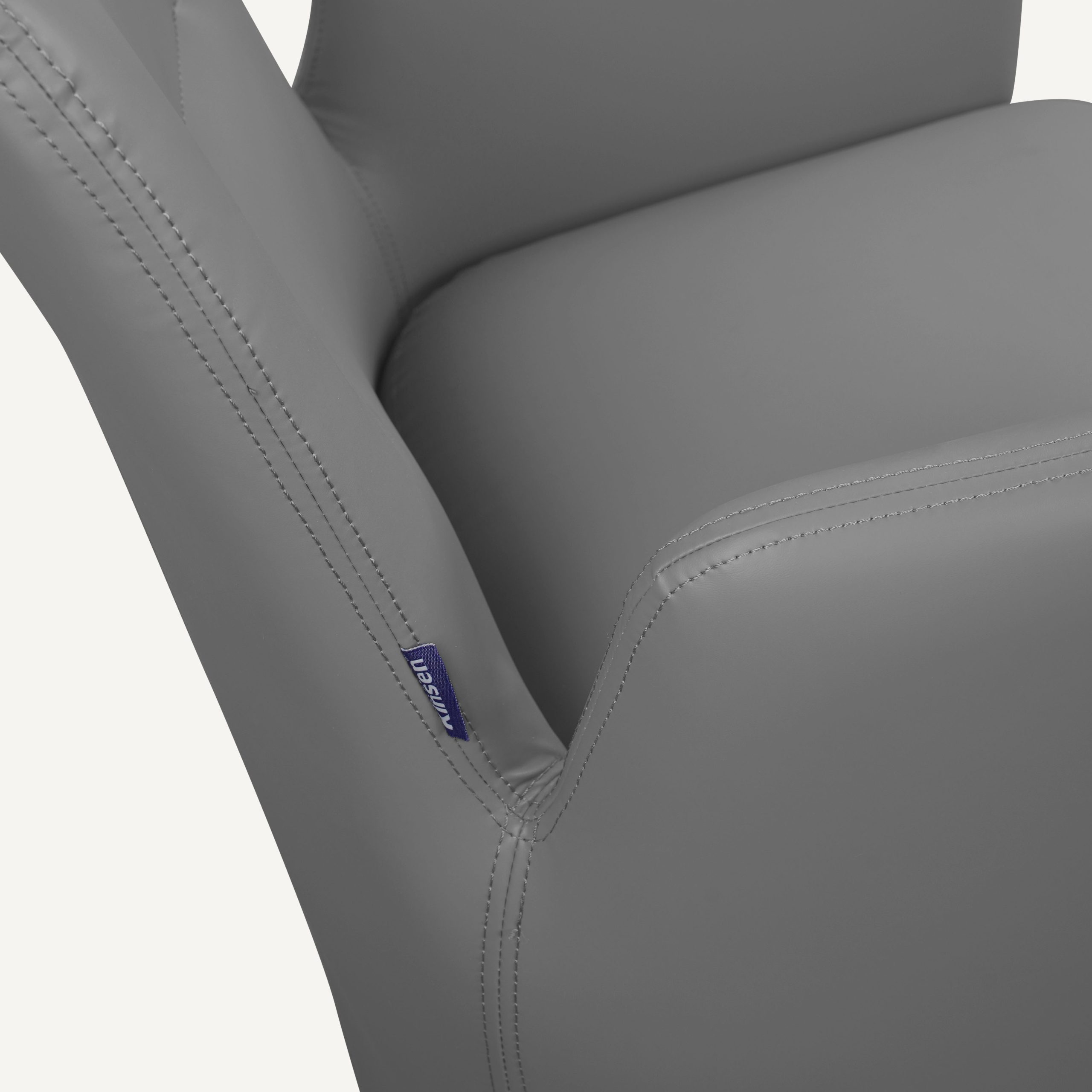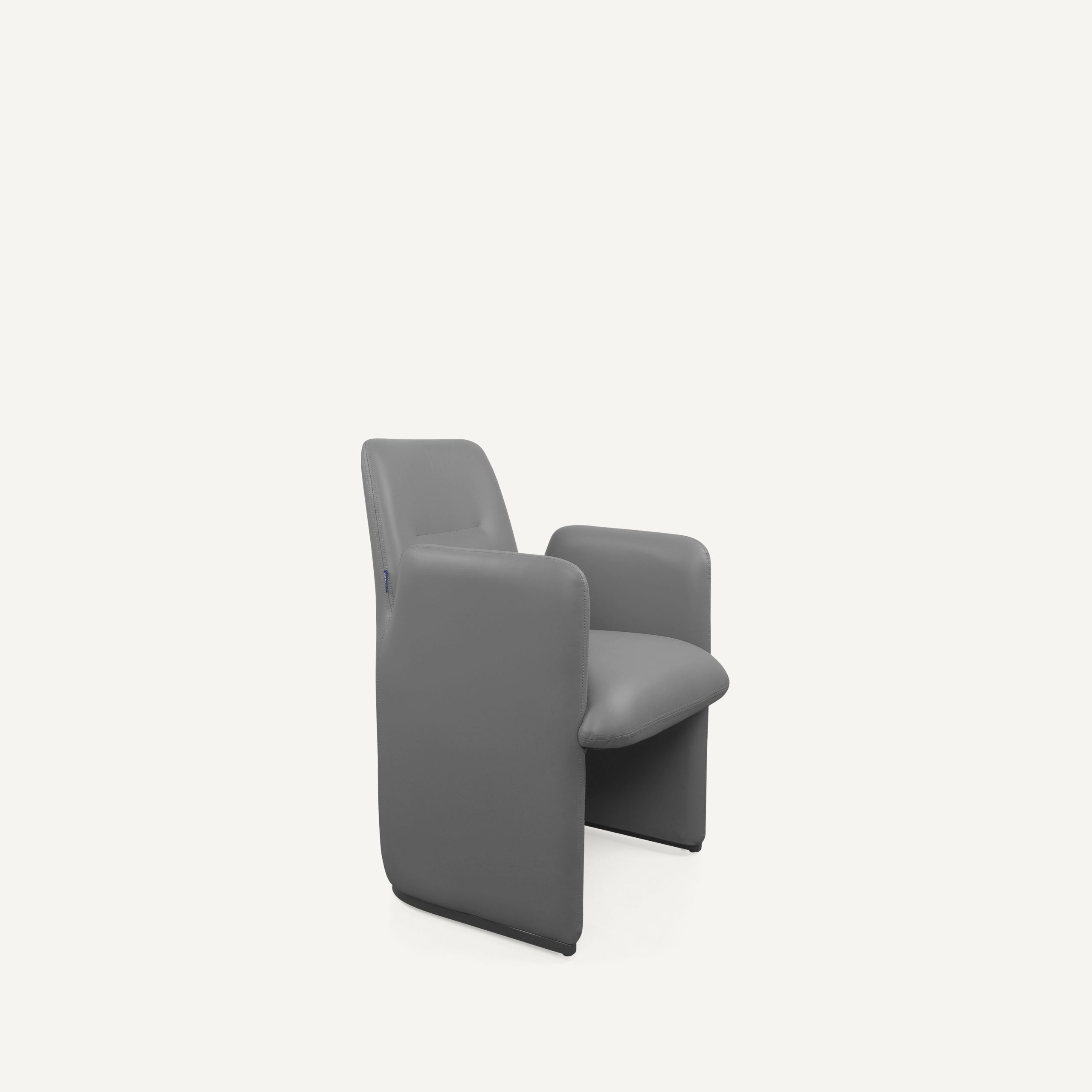 The Kanz chair is a sophisticated fusion of architectural form and ergonomic function, characterized by its bold, monolithic silhouette and seamless integration of components. Upholstered in premium slate-grey synthetic leather, the chair features a continuous outer shell where the high, slab-style armrests flow directly into the base panels, creating a sense of grounded stability and privacy for the user. The interior is anchored by a thickly padded seat designed for long-duration comfort, complemented by a subtly contoured backrest featuring a single horizontal stitch detail for a touch of tailored refinement. While the exterior maintains a clean, upholstered look, the structure is reinforced by metal chrome legs at the contact points, providing a durable, industrial foundation that elevates the chair slightly off the floor. Choosing the Kanz chair offers several distinct advantages, particularly for those seeking a balance between luxury and practicality. The synthetic leather provides a high-end aesthetic that is exceptionally durable and easy to maintain, as it resists spills and stains better than natural fibers or genuine hides. Ergonomically, the high-walled design provides superior lateral support, "cradling" the body to reduce fatigue during extended use in a boardroom or home office. Furthermore, the wide, flat base panels distribute weight more effectively than traditional thin legs, making it an excellent choice for protecting sensitive hardwood or carpeted flooring from pressure marks. Its minimalist, neutral design ensures it remains a timeless centerpiece that can adapt to evolving interior decor styles over time.