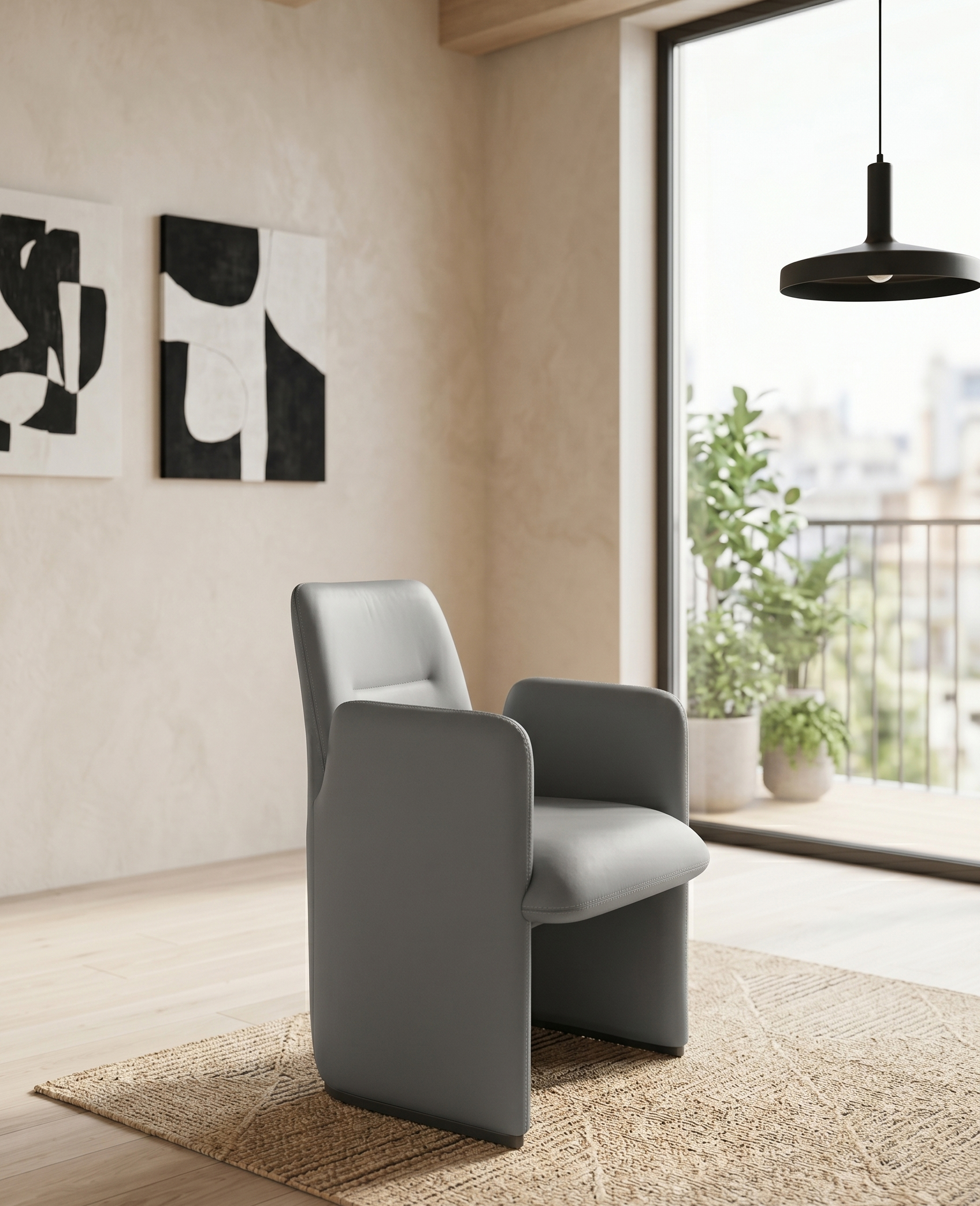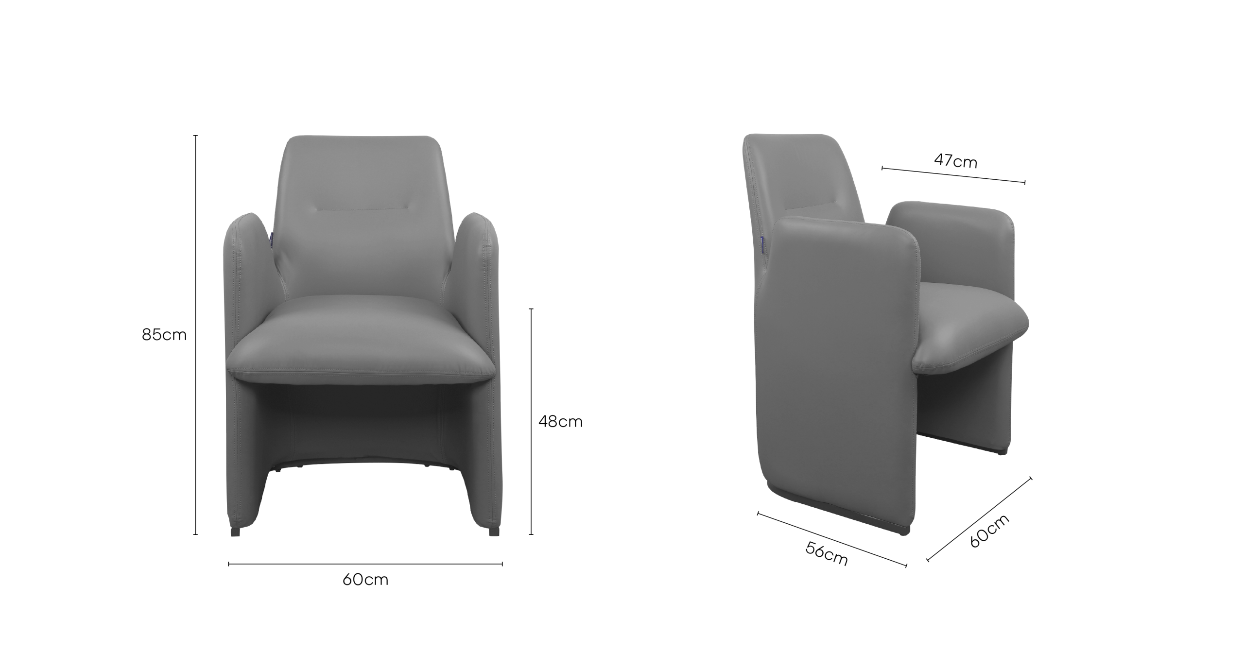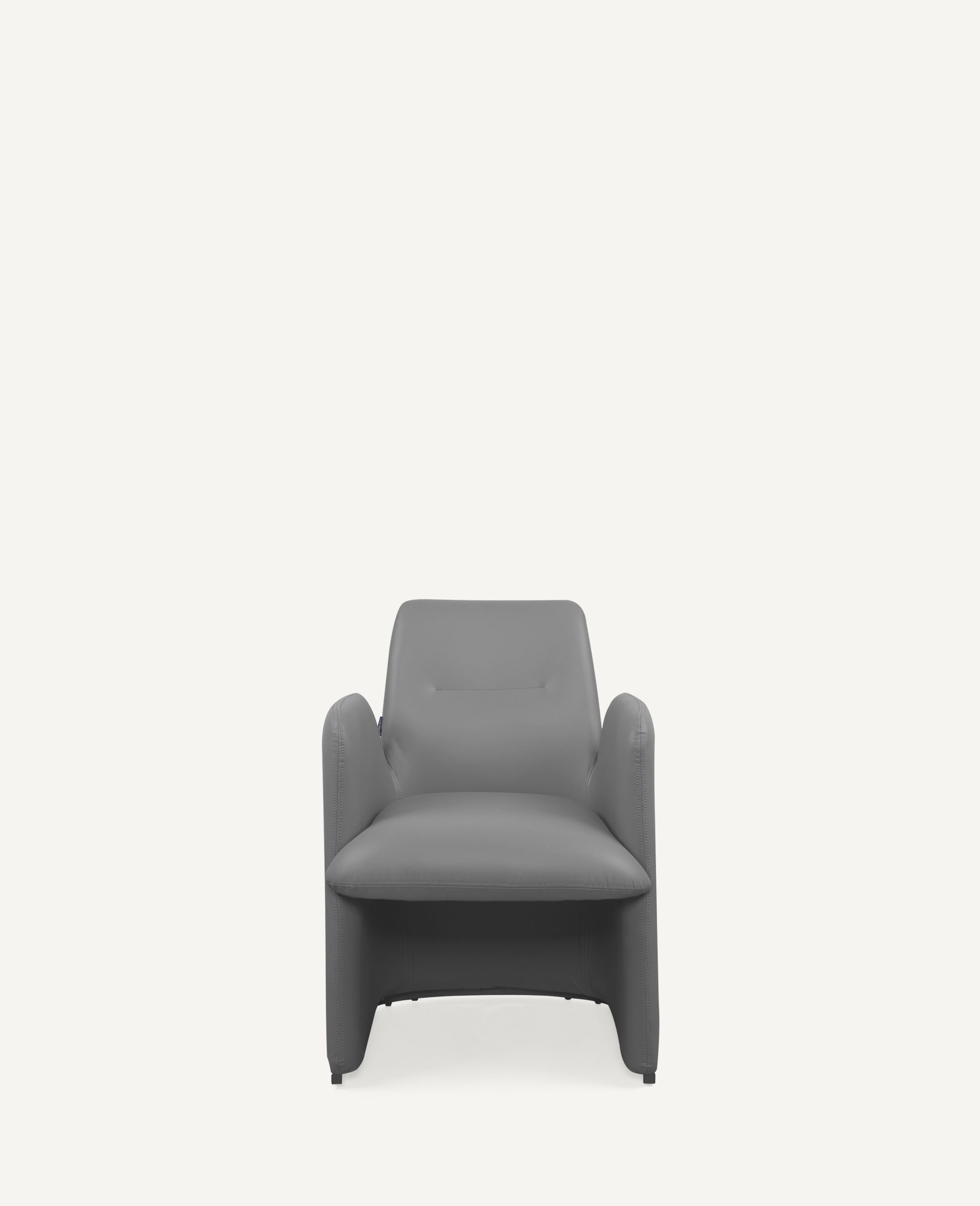 The Kanz chair is a sophisticated fusion of architectural form and ergonomic function, characterized by its bold, monolithic silhouette and seamless integration of components. Upholstered in premium slate-grey synthetic leather, the chair features a continuous outer shell where the high, slab-style armrests flow directly into the base panels, creating a sense of grounded stability and privacy for the user. The interior is anchored by a thickly padded seat designed for long-duration comfort, complemented by a subtly contoured backrest featuring a single horizontal stitch detail for a touch of tailored refinement. While the exterior maintains a clean, upholstered look, the structure is reinforced by metal chrome legs at the contact points, providing a durable, industrial foundation that elevates the chair slightly off the floor. Choosing the Kanz chair offers several distinct advantages, particularly for those seeking a balance between luxury and practicality. The synthetic leather provides a high-end aesthetic that is exceptionally durable and easy to maintain, as it resists spills and stains better than natural fibers or genuine hides. Ergonomically, the high-walled design provides superior lateral support, "cradling" the body to reduce fatigue during extended use in a boardroom or home office. Furthermore, the wide, flat base panels distribute weight more effectively than traditional thin legs, making it an excellent choice for protecting sensitive hardwood or carpeted flooring from pressure marks. Its minimalist, neutral design ensures it remains a timeless centerpiece that can adapt to evolving interior decor styles over time.