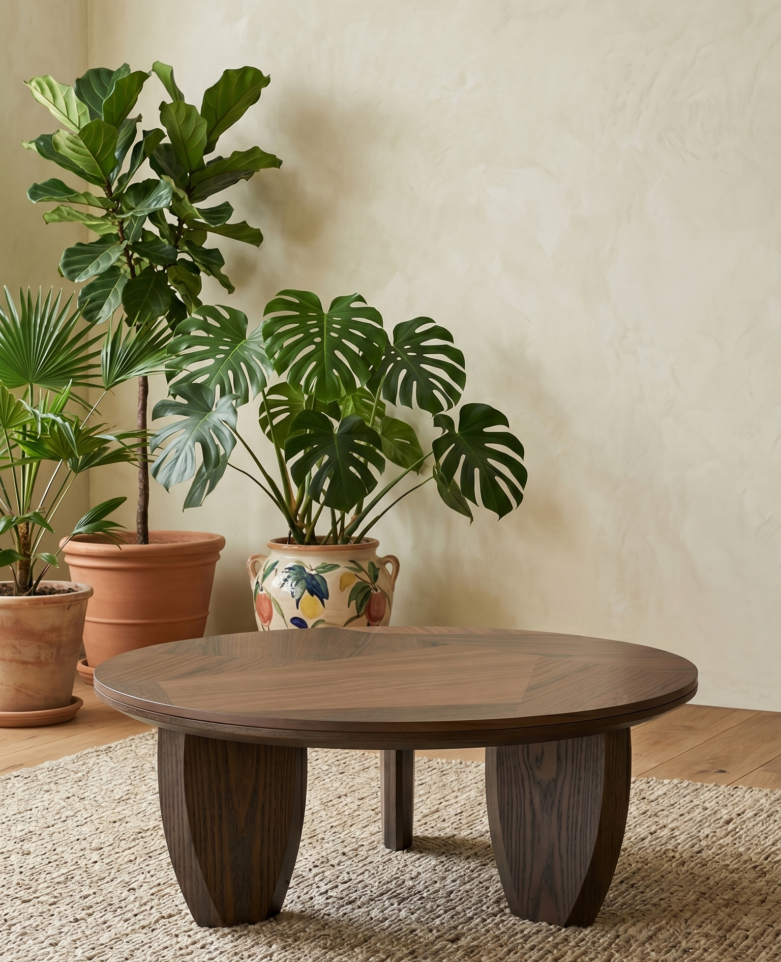 The Darius Coffee Table Set is a stunning embodiment of organic modern design, featuring a sculptural silhouette that effortlessly blends robust stability with refined elegance. This nesting duo is defined by its substantial, tapered pedestal bases crafted from rich, dark-stained walnut wood, which anchors the space with a sense of warmth and earthiness. The tabletops break away from rigid geometry, adopting a soft, pebble-like triangular shape with smooth, rounded edges that are both visually soothing and practical for high-traffic living areas. The true highlight of the design is the exquisite mixed-material surface: a thick, beveled wooden rim frames a luxurious central insert of light cream travertine or sintered stone. This contrast between the deep, organic wood grain and the cool, matte stone creates a sophisticated tactile experience, making the table not just a functional surface, but a captivating centerpiece perfect for Japandi, minimalist, or contemporary interiors.