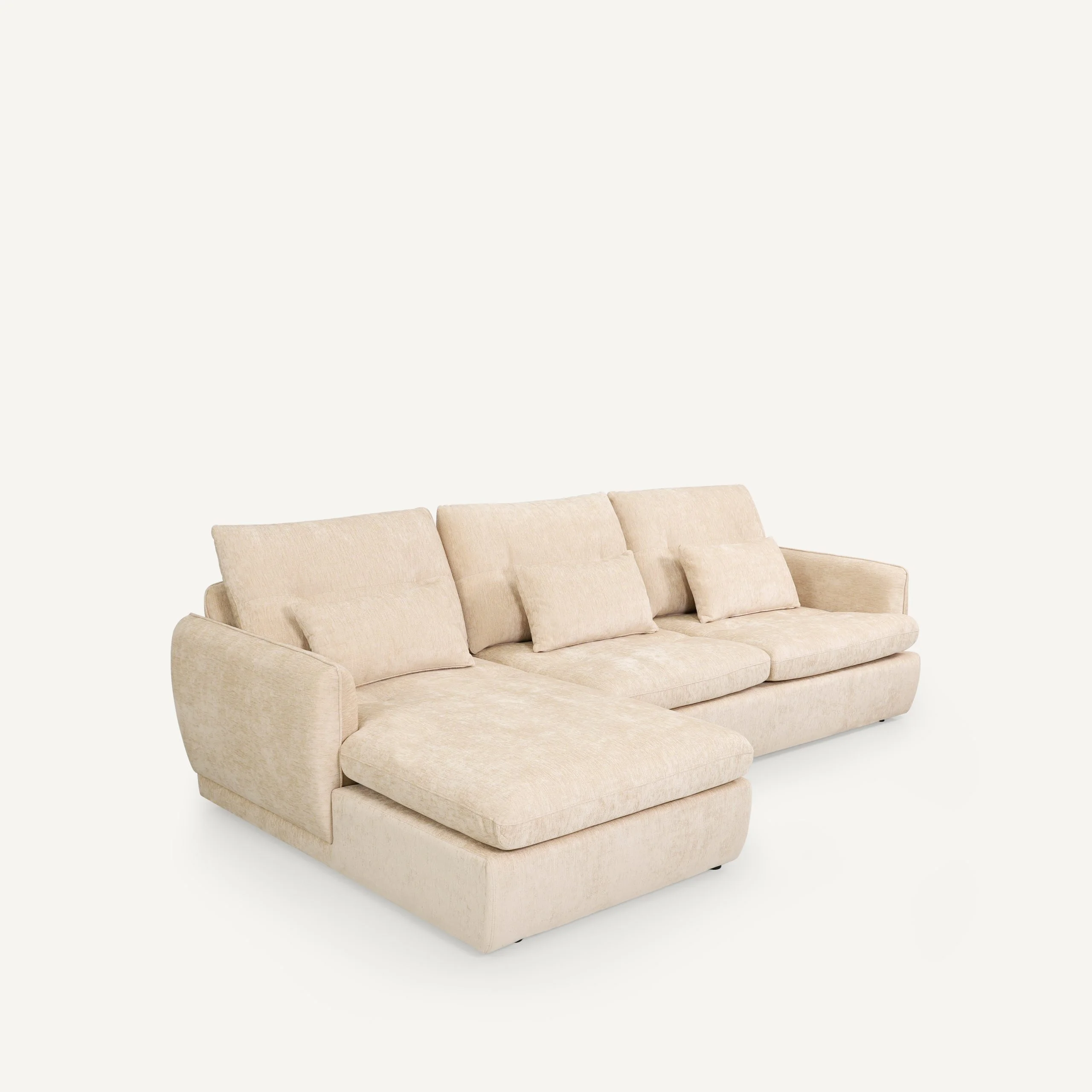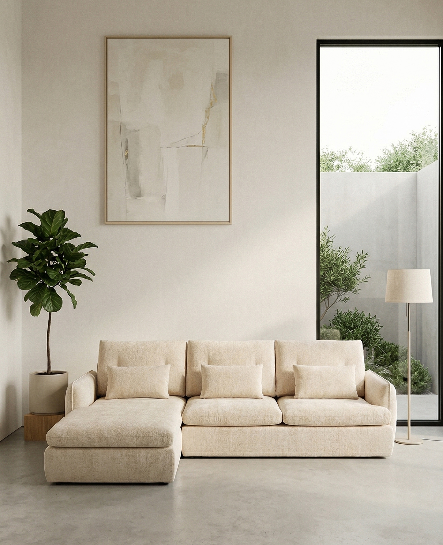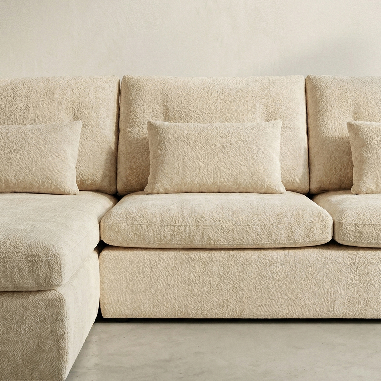 Maris – A sprawling L-shaped sectional that redefines the art of lounging with its low-profile, architectural presence. Defined by its massive, deep-seated cushions and wide-set silhouette, Maris provides an expansive landscape for relaxation.