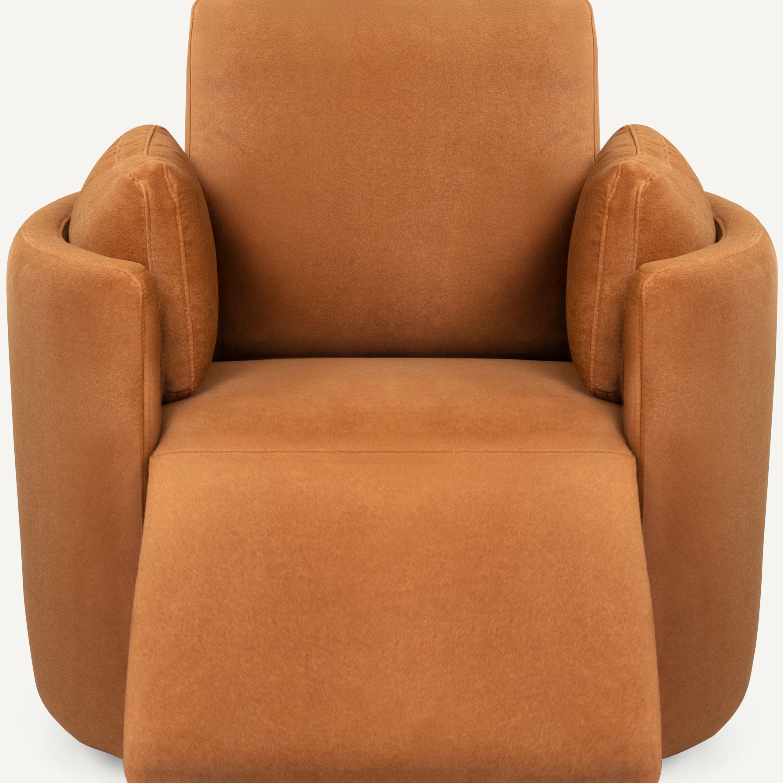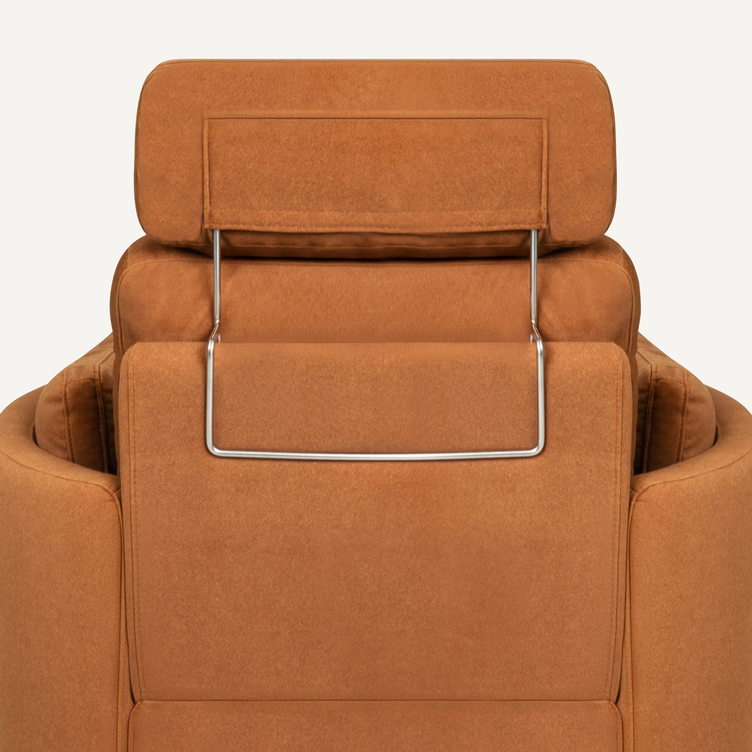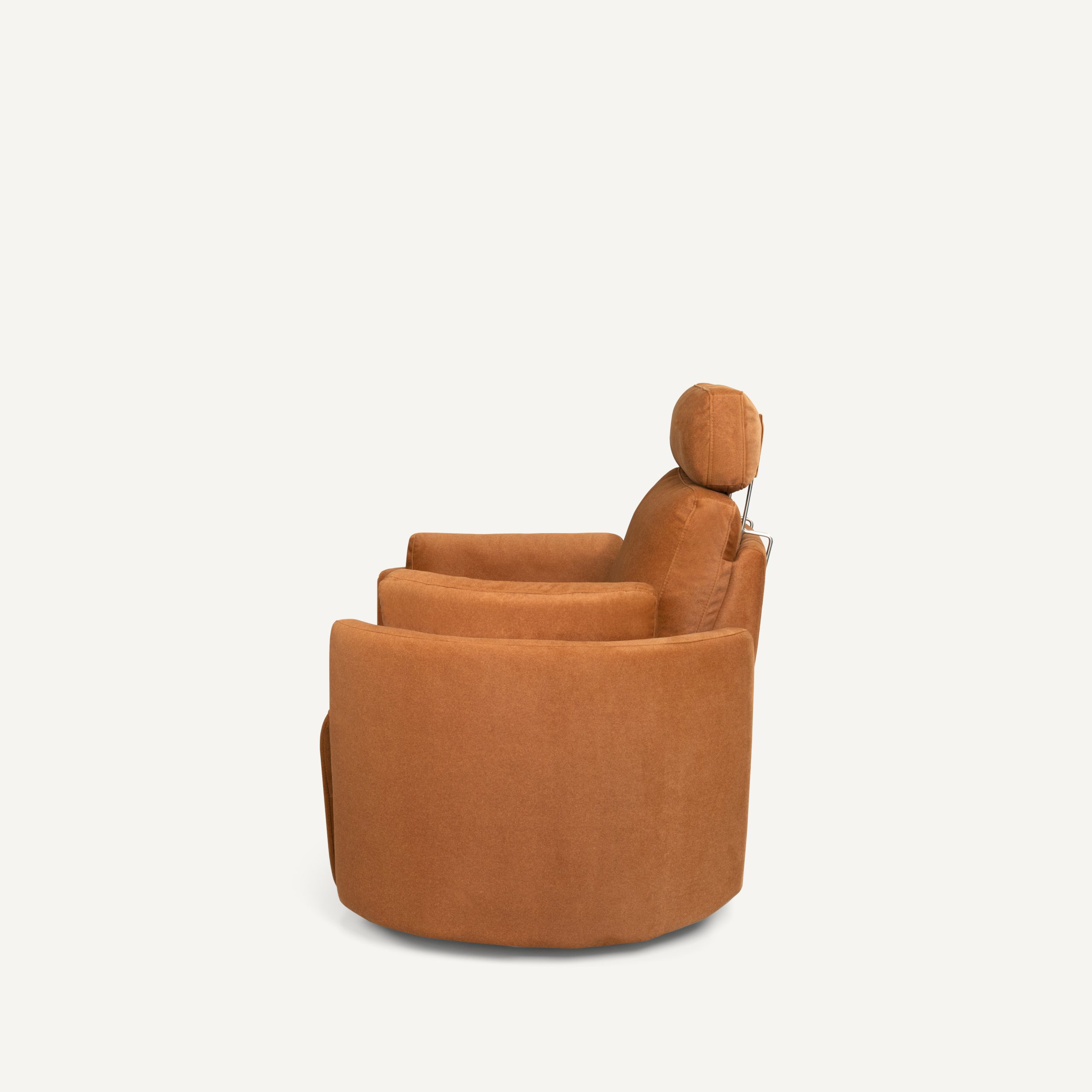 Mazie – A high-back power recliner that redefines personal relaxation with its sculptural, cocoon-like form. Wrapped in a rich, warm-toned fabric and featuring an integrated headrest and footrest, Mazie combines modern architectural lines with deep-seated comfort—perfect for a private reading nook, a nursery, or a contemporary lounge.