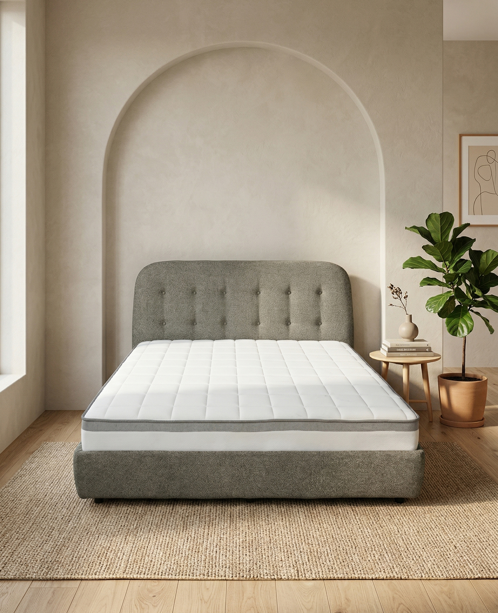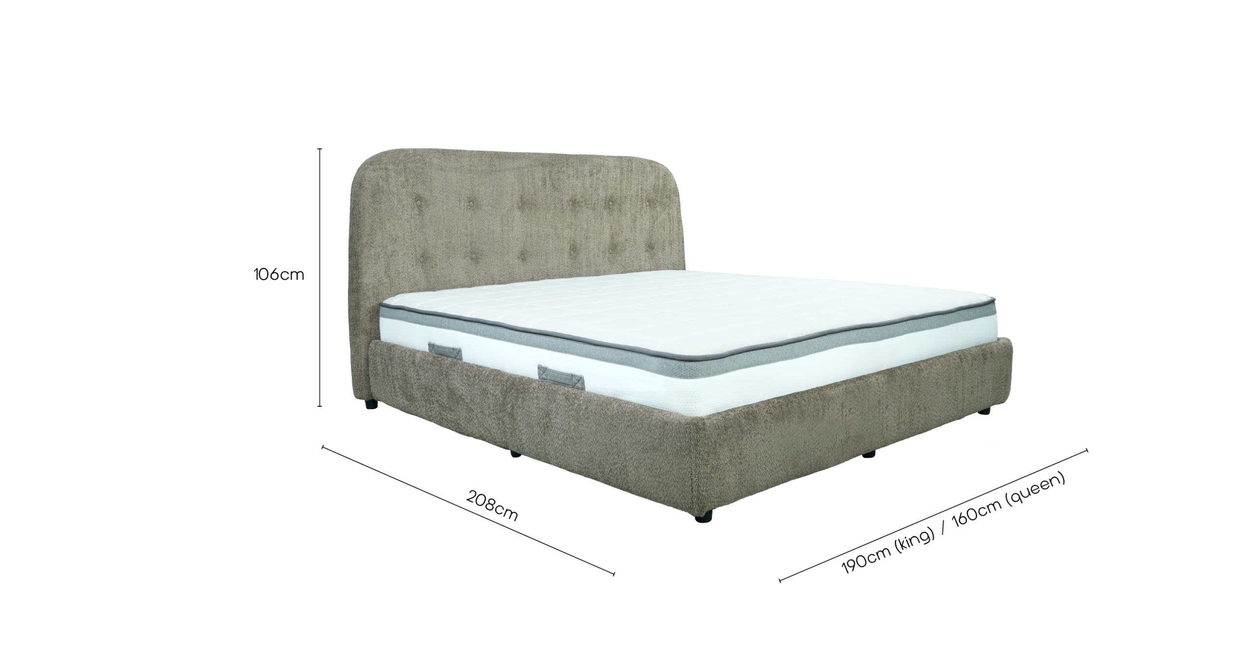 Create a serene and inviting sleep space with the Neon bed. Its unique curved headboard features delicate button tufting, adding a touch of classic texture to a modern, clean-lined frame. Wrapped in a durable, textured gray fabric, this bed offers a low-profile aesthetic that brings a sense of calm and understated luxury to your master suite.