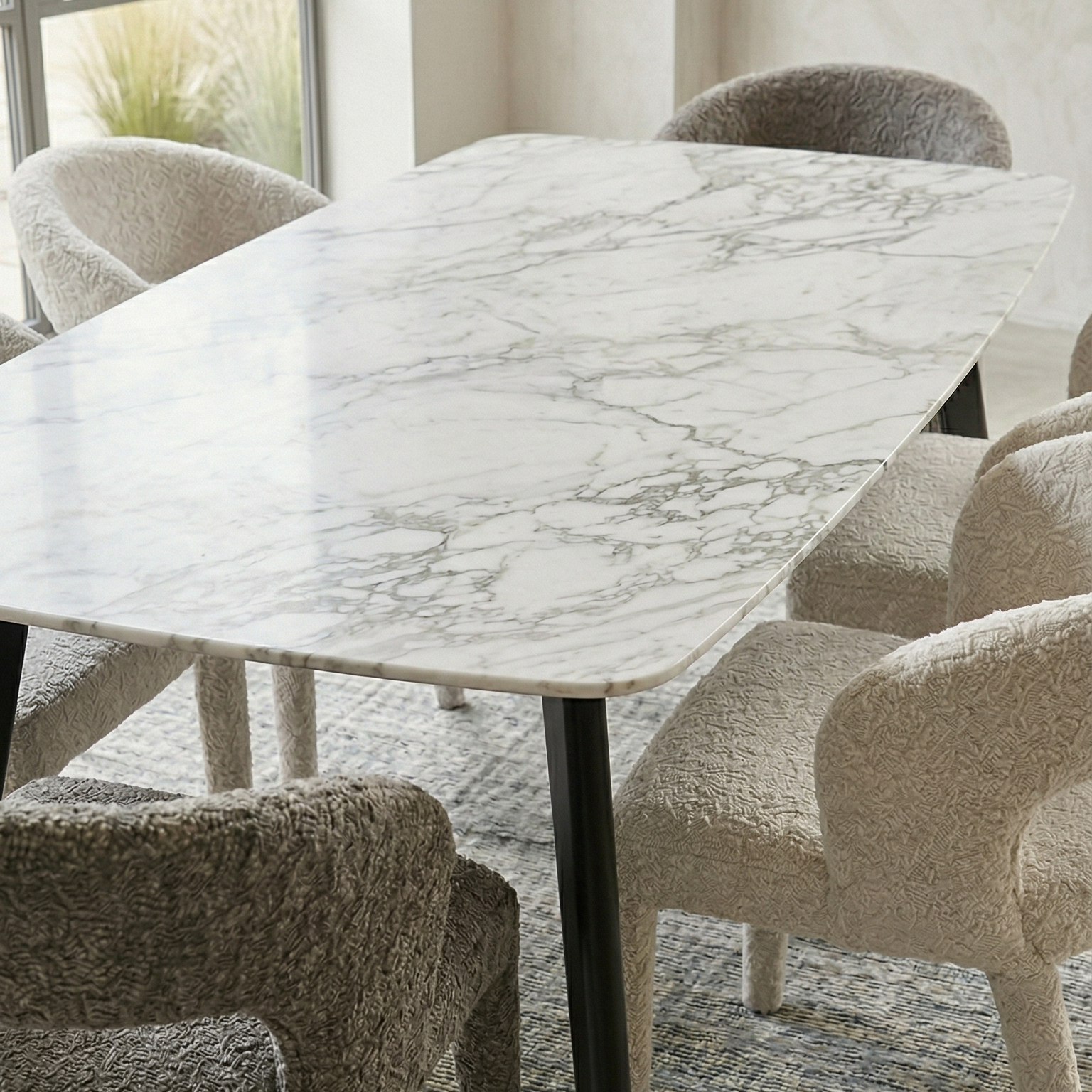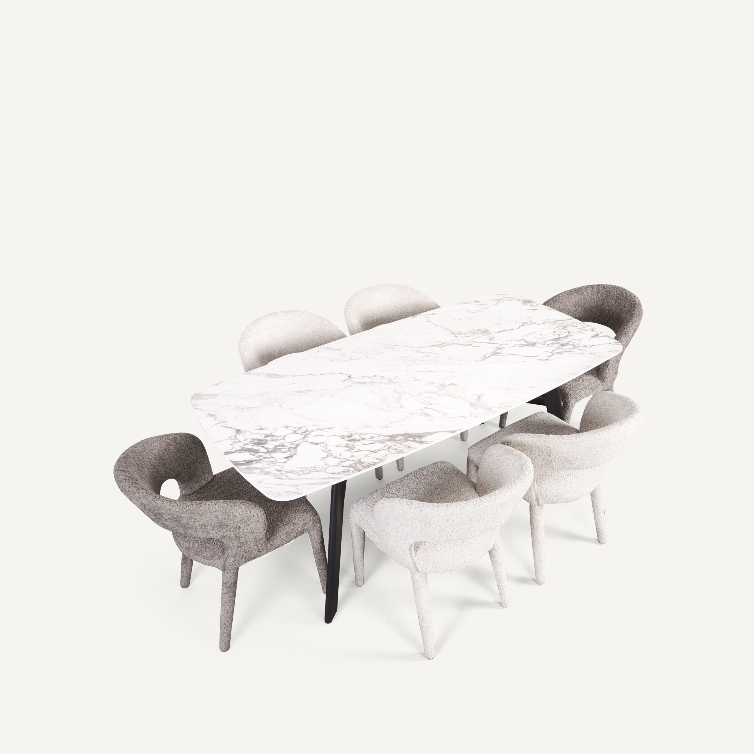 A striking curated ensemble that masterfully balances a minimalist, architectural table with bold, sculptural seating. This pairing highlights the contrast between the sharp, slim lines of the Sansa table and the organic, high-texture volumes of the Marty chairs, creating a dining environment that feels both futuristic and inviting.