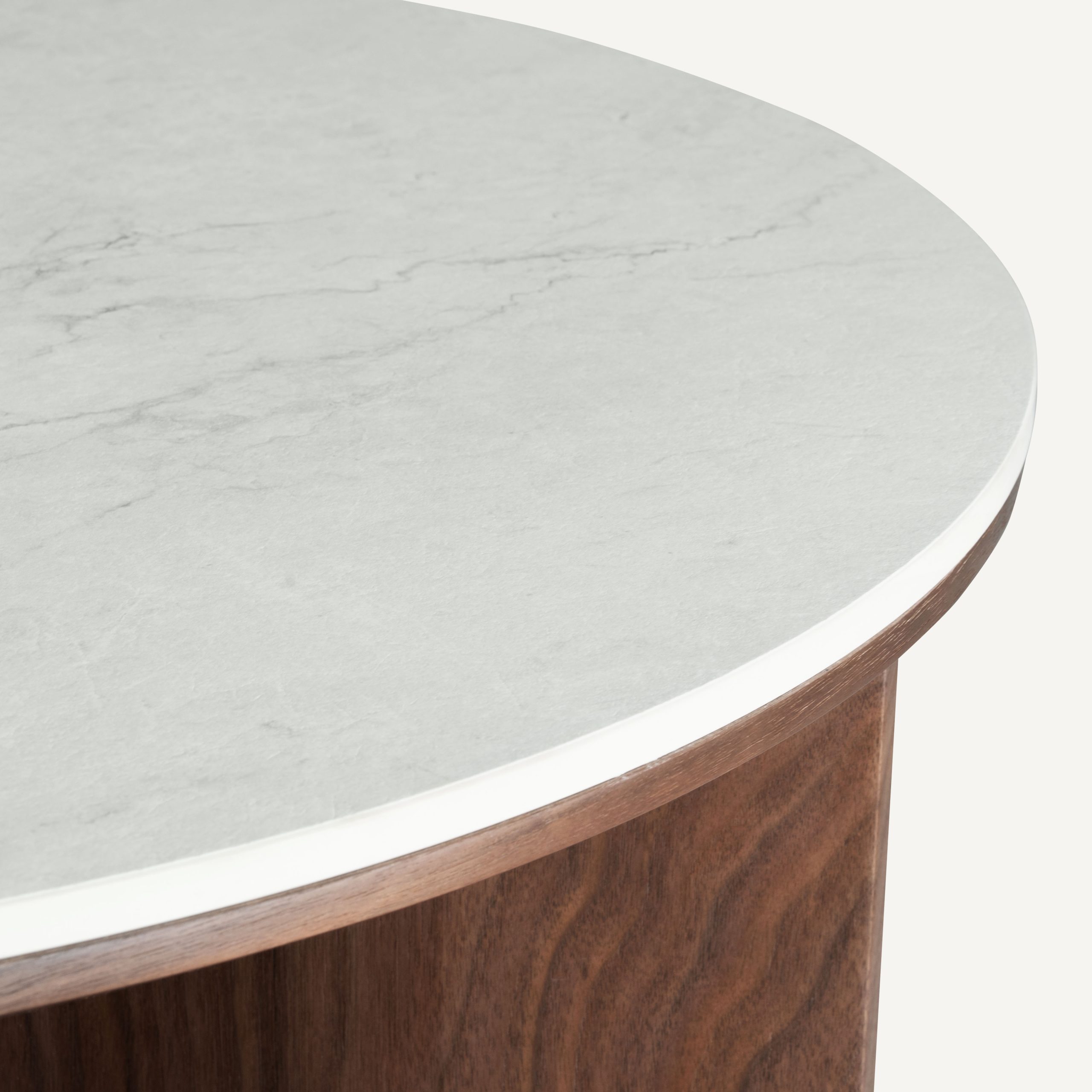 - It showcases a sophisticated blend of textures, framing a cool, cream-colored stone insert (travertine or sintered stone) within a warm, dark walnut wood rim for an elegant, high-end look.
