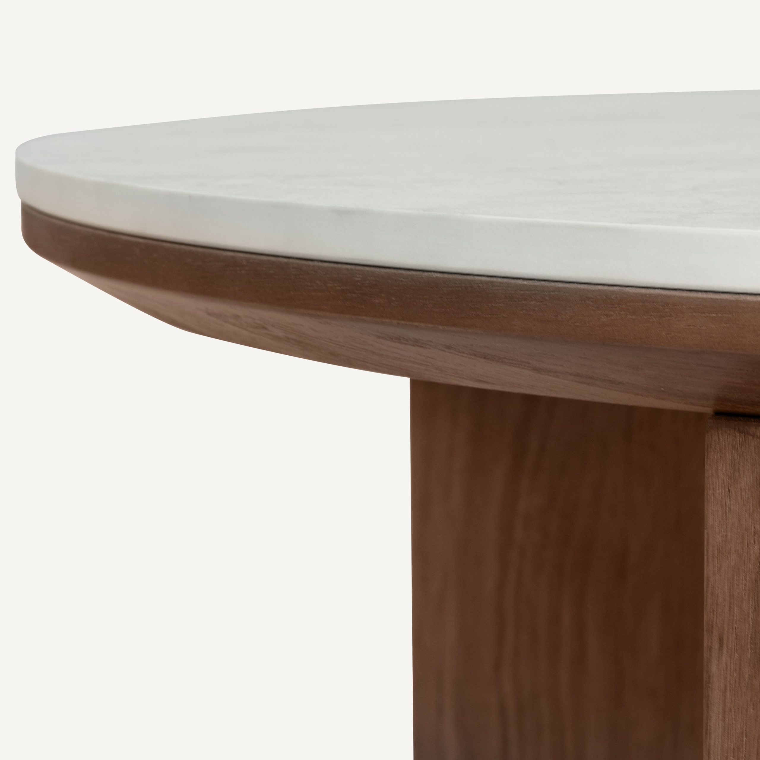 - The tabletops rest on robust, tapered conical bases made of solid wood, providing exceptional stability while acting as a bold architectural statement piece grounded in modern minimalism.