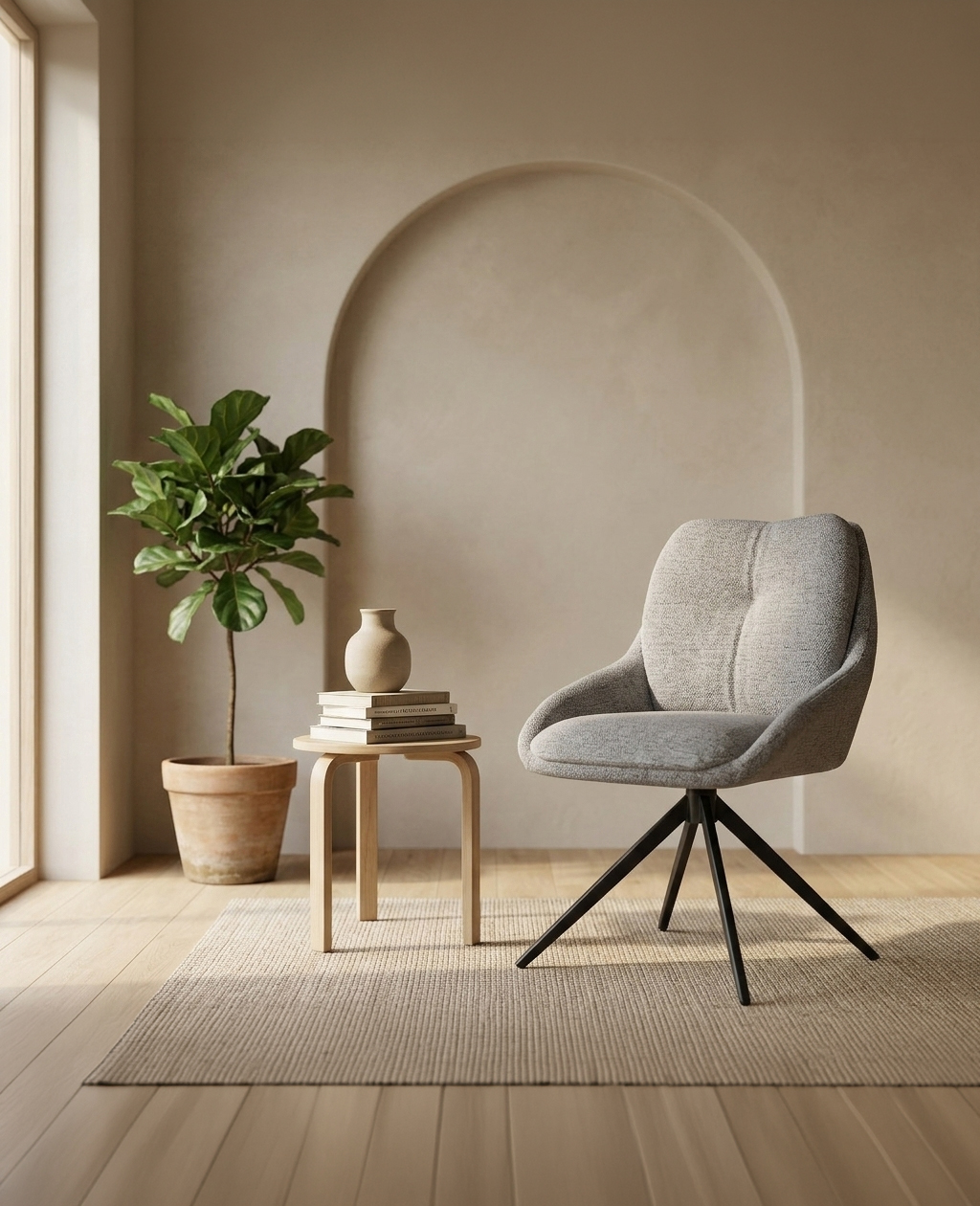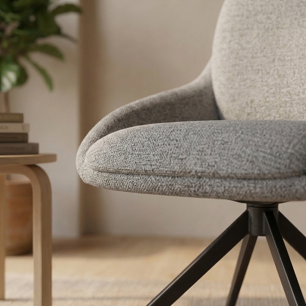 The Slaz chair represents the pinnacle of contemporary seating, blending a sculptural, modern silhouette with a commitment to sustainable craftsmanship. Upholstered in premium Oeko-Tex® certified fabric, this chair ensures an eco-friendly and skin-safe experience without sacrificing the sophisticated, textured look of high-end upholstery. Its deeply padded seat is ergonomically contoured and features a smooth swivel function, providing both exceptional comfort and effortless mobility for long-duration use. This plush upper is perfectly balanced by a robust set of epoxy steel legs, featuring a tapered star-base design that offers industrial-grade durability and a sleek, scratch-resistant finish. Choosing the Slaz chair means investing in a piece that prioritizes both stability and style. The integrated swivel mechanism allows for seamless transitions and versatility in any workspace or dining area, while the high-performance epoxy coating on the steel frame ensures long-term resilience. Its minimalist aesthetic and neutral palette allow it to integrate seamlessly into diverse interior themes, from Scandinavian-inspired spaces to modern layouts. By combining structural integrity with meticulous attention to material safety, the Slaz chair delivers a seating solution that is as reliable as it is visually striking.