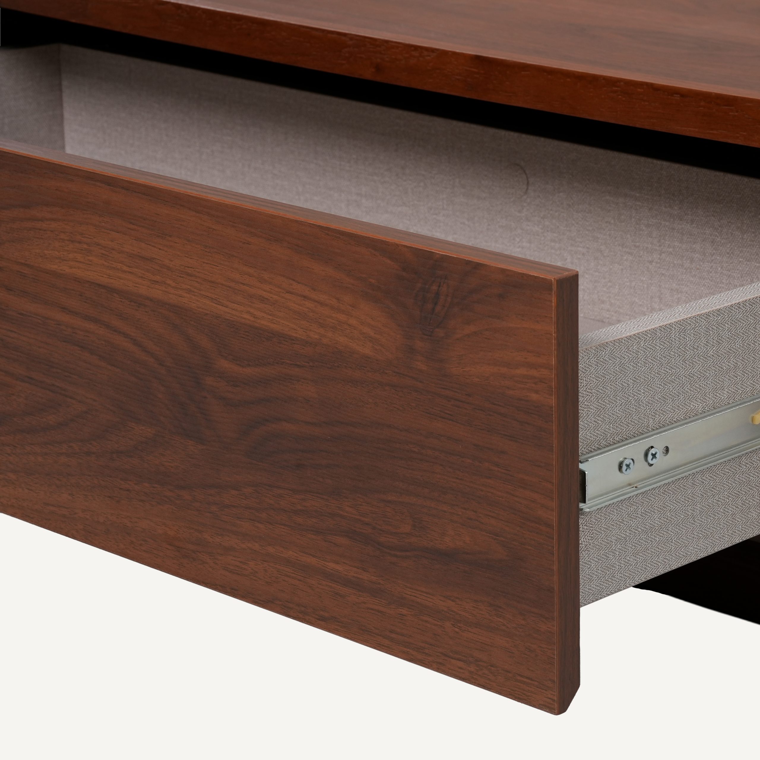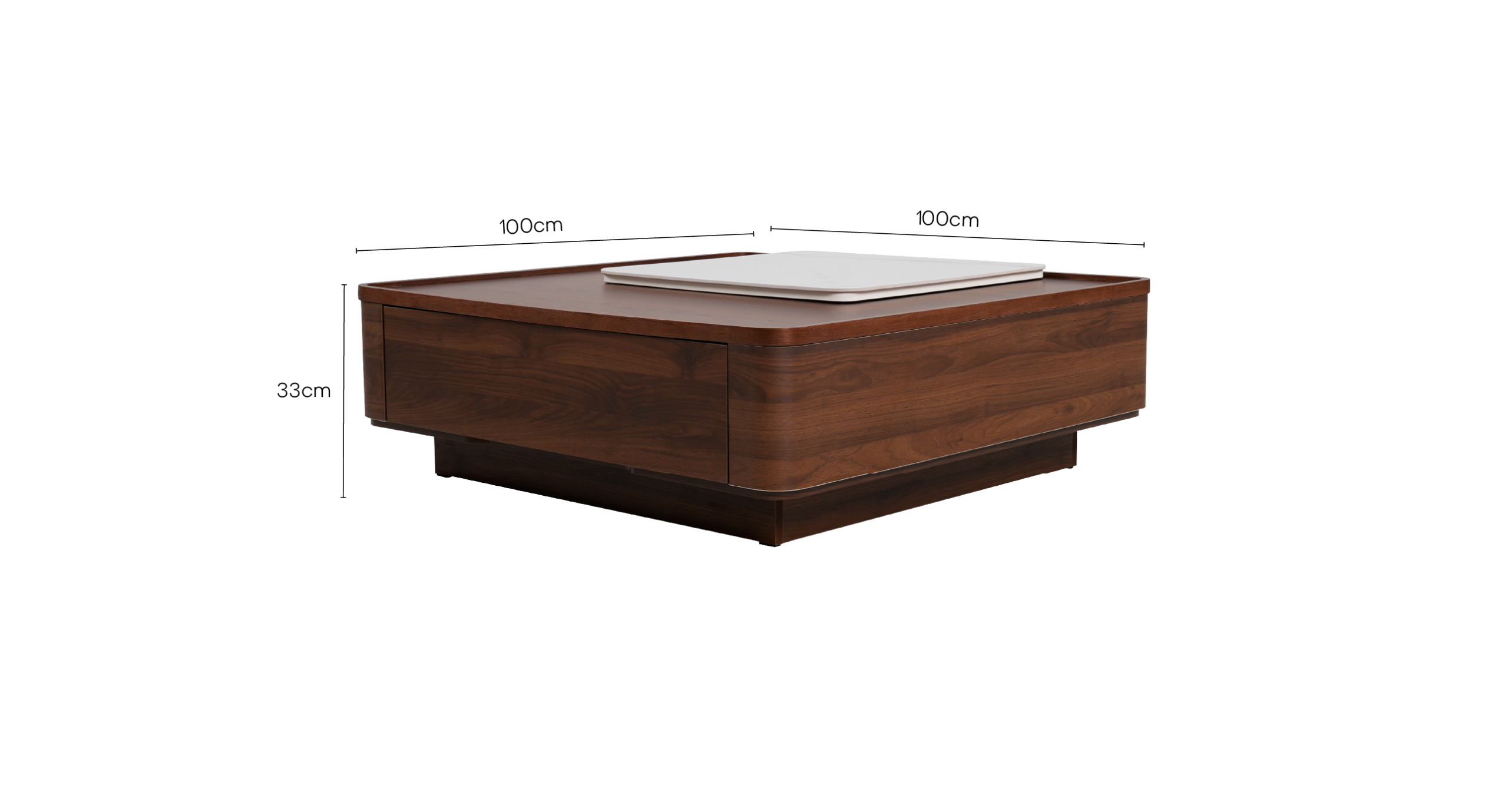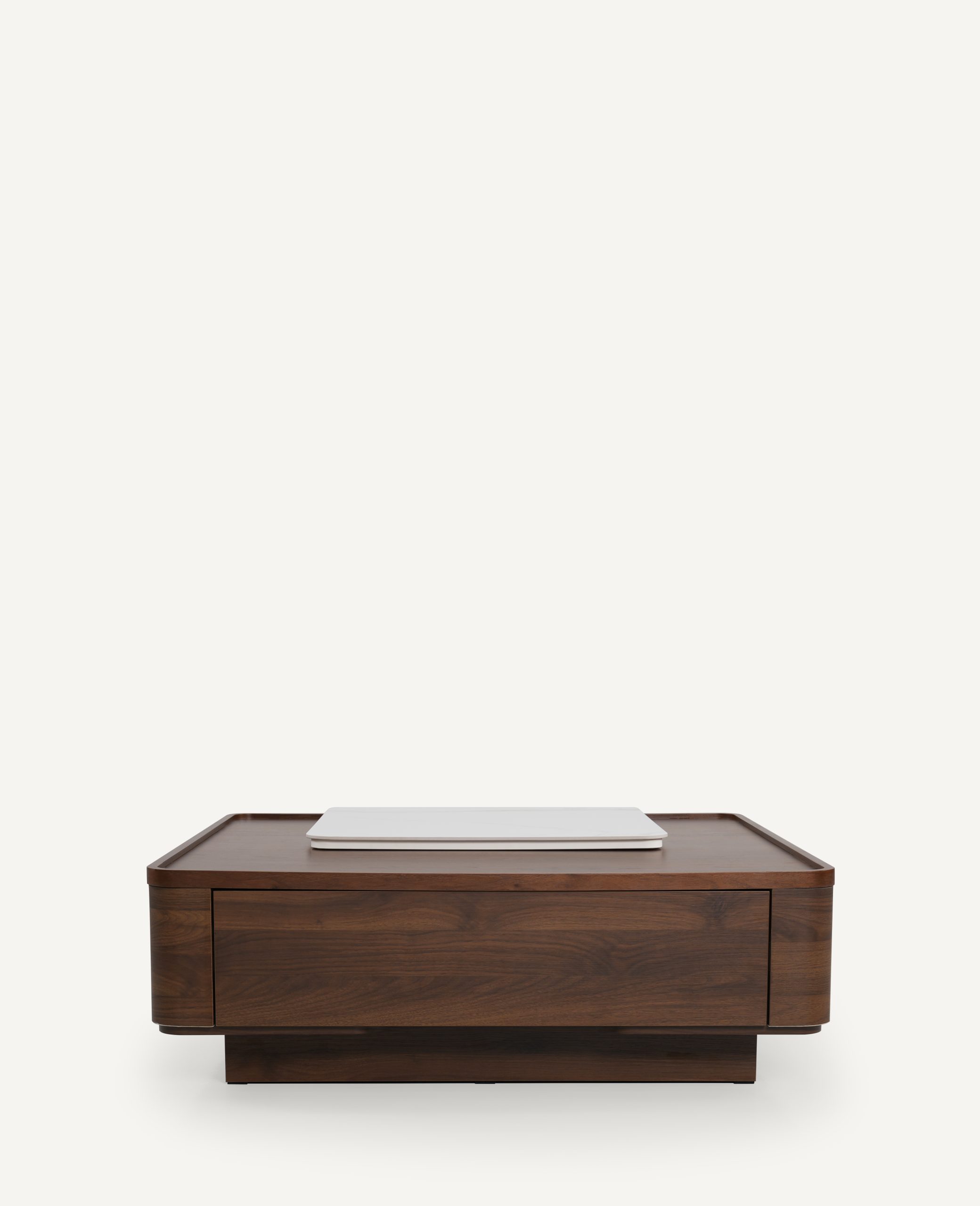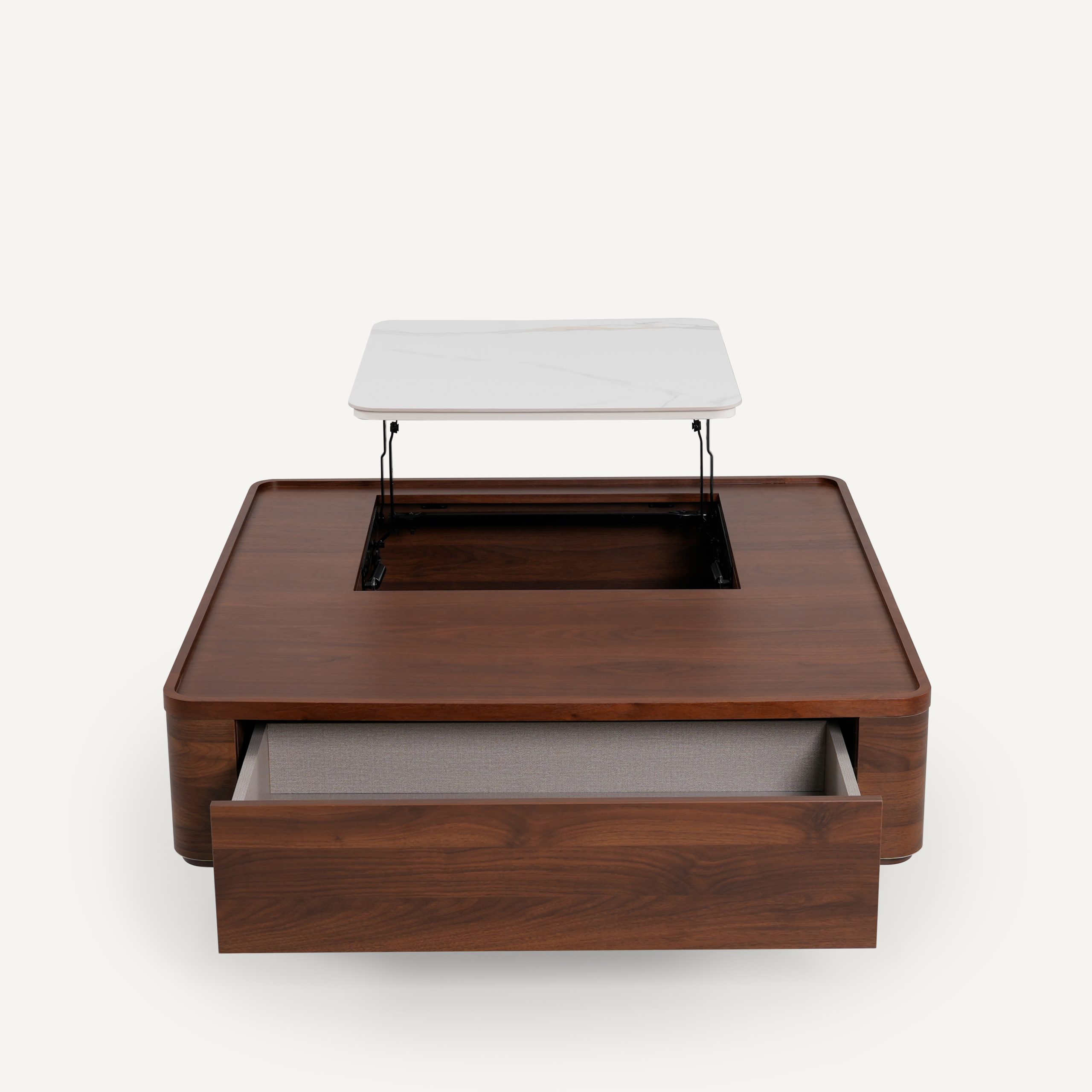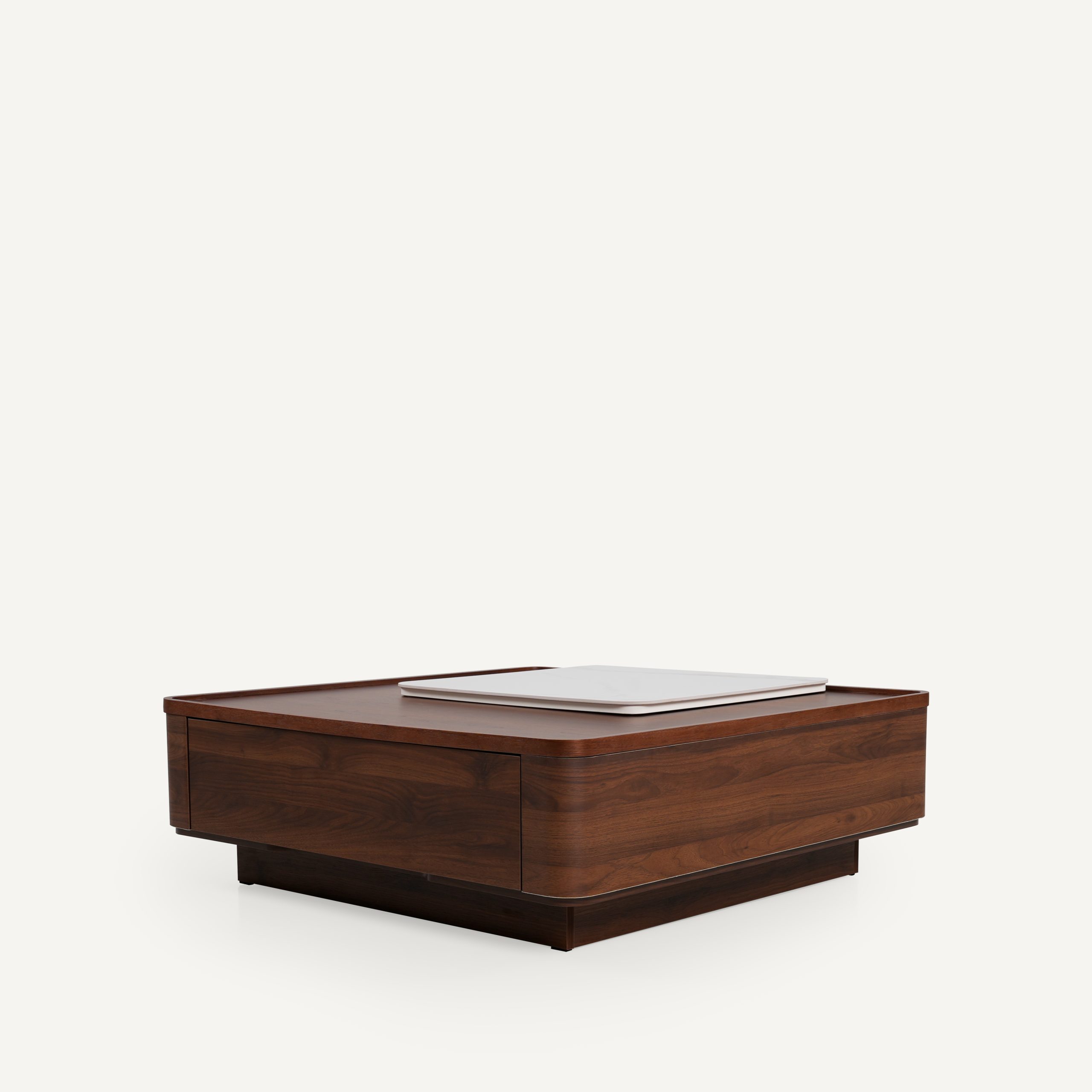 A sophisticated coffee table that masterfully blends organic warmth with contemporary geometry. Featuring a rich wood-toned frame and a distinctive raised marble-look insert, this square piece sits on a recessed plinth base to create a modern, grounded silhouette. Its clever mix of textures and built-in storage makes it a functional masterpiece for the designer living room.