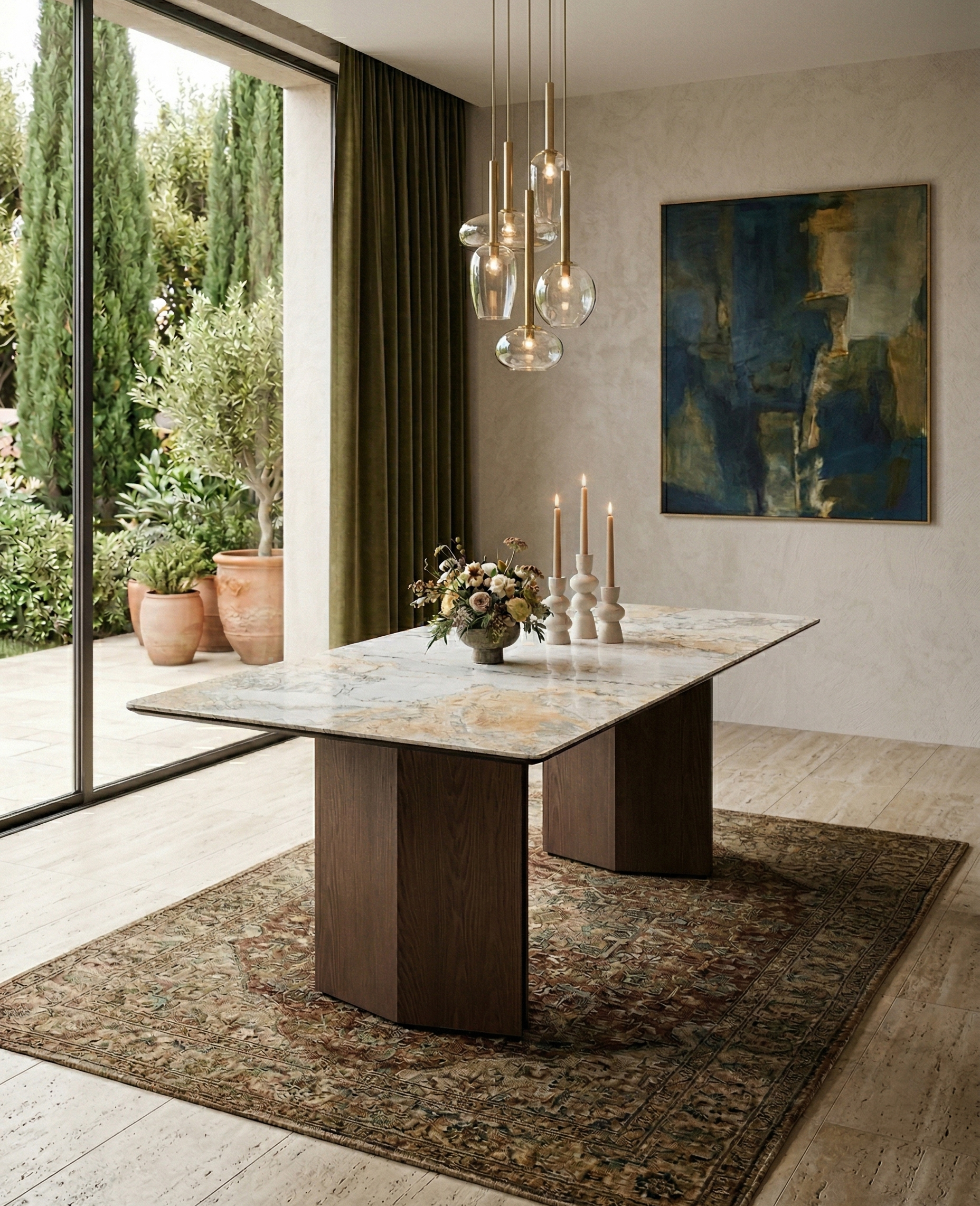 Weekend vibes feel even better when you’re surrounded by loved ones at home, and this Sinoti table—featuring an ultra-strong, heat-resistant sintered stone top that’s highly scratch-proof, stain-resistant, and built to withstand daily use. This table paired with a sturdy walnut veneer base known for its durability, stability, and rich natural warmth—creates the perfect setting for family bonding, meal time, chitchat, and shared laughter, offering a simple, versatile design that blends effortlessly with any interior style and becomes the spot where meaningful family memories are made.