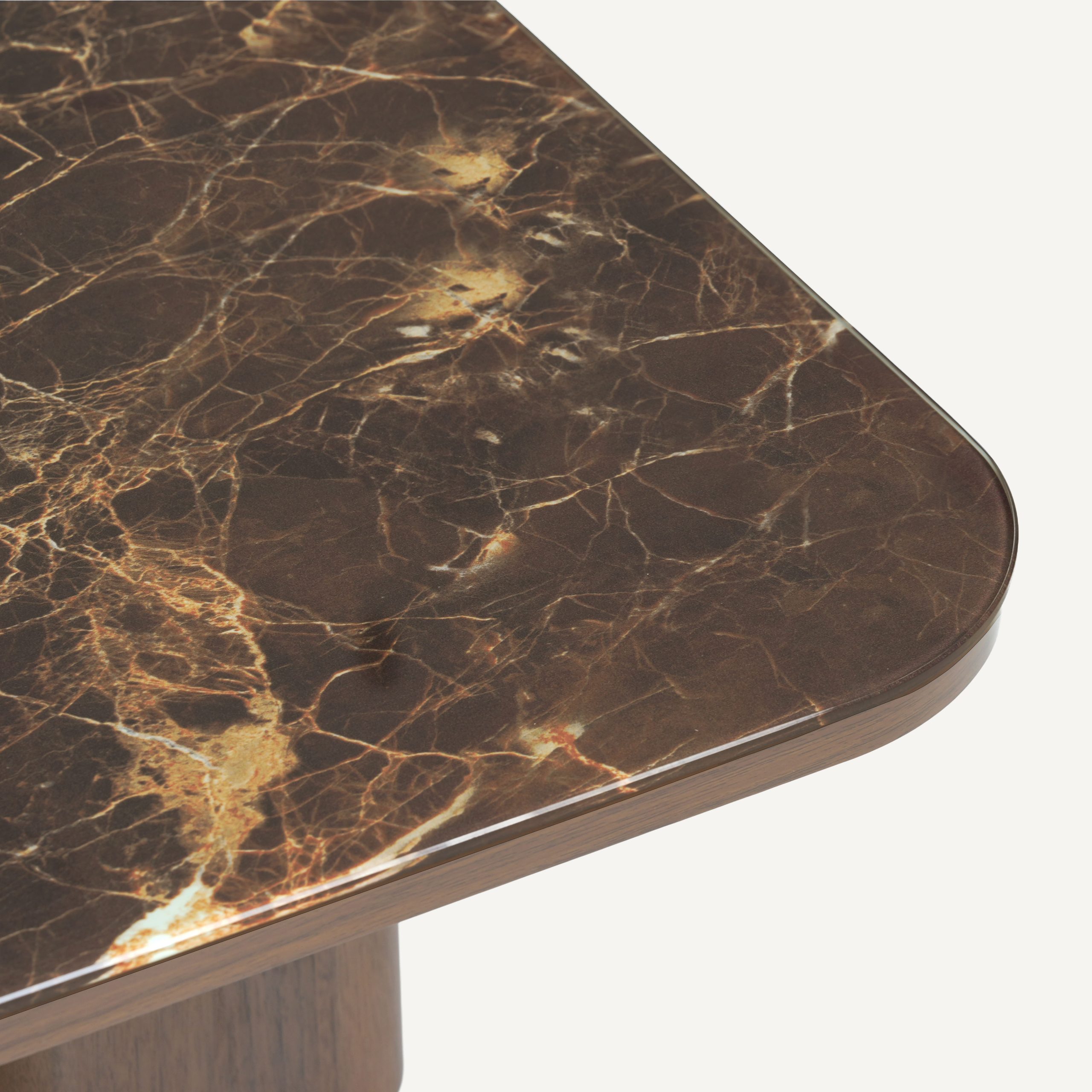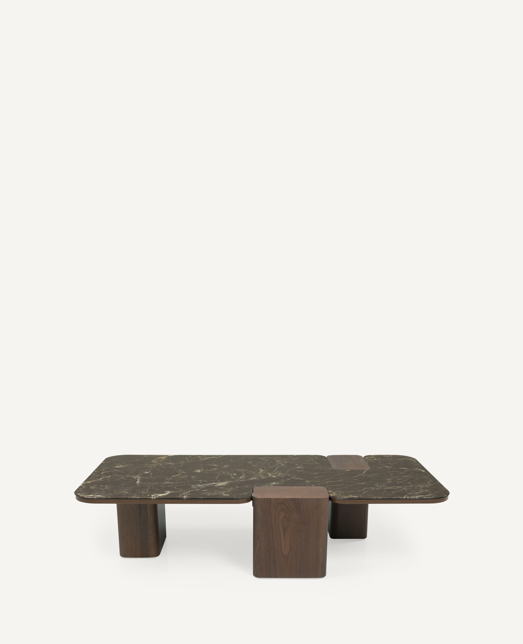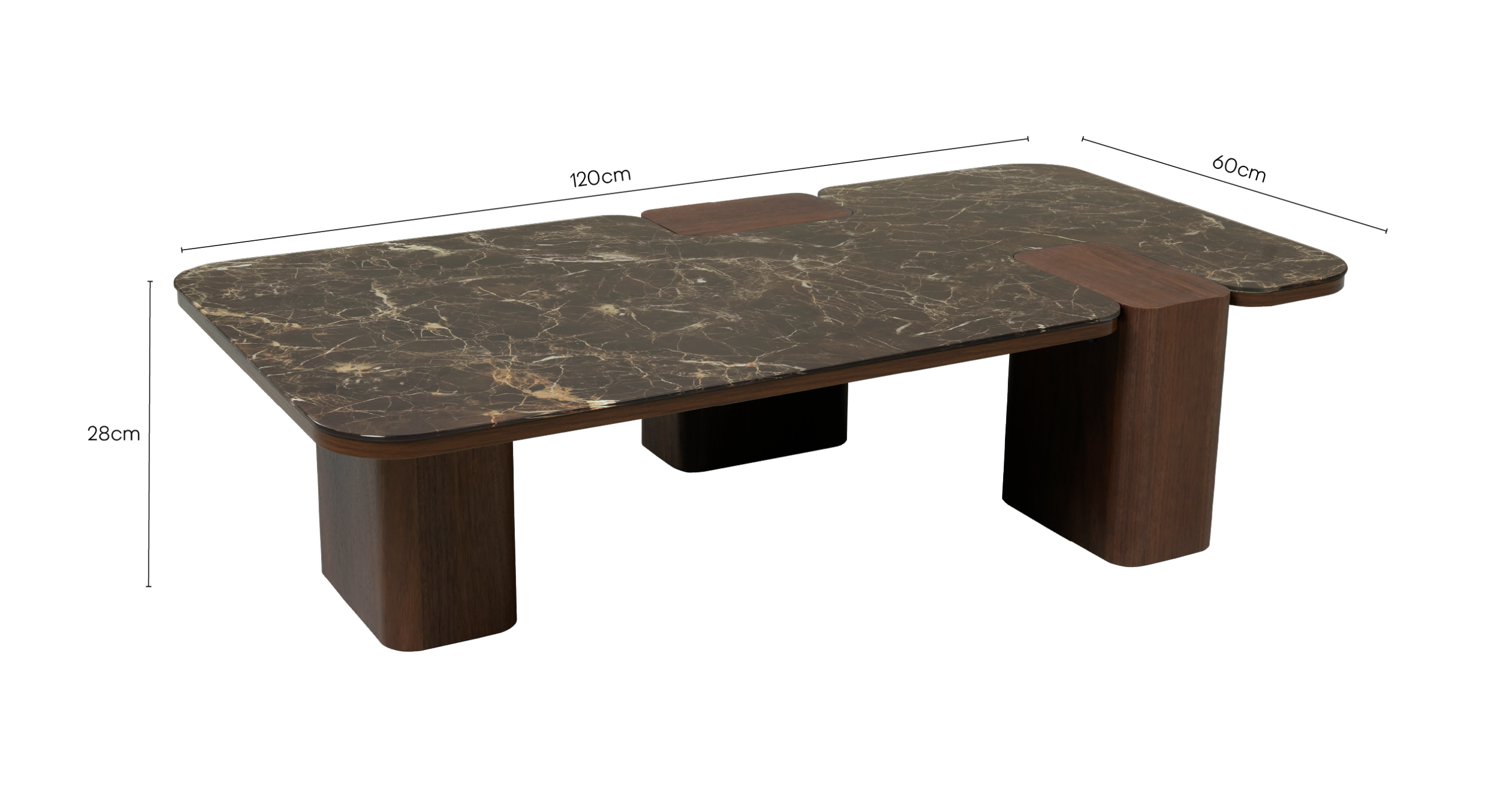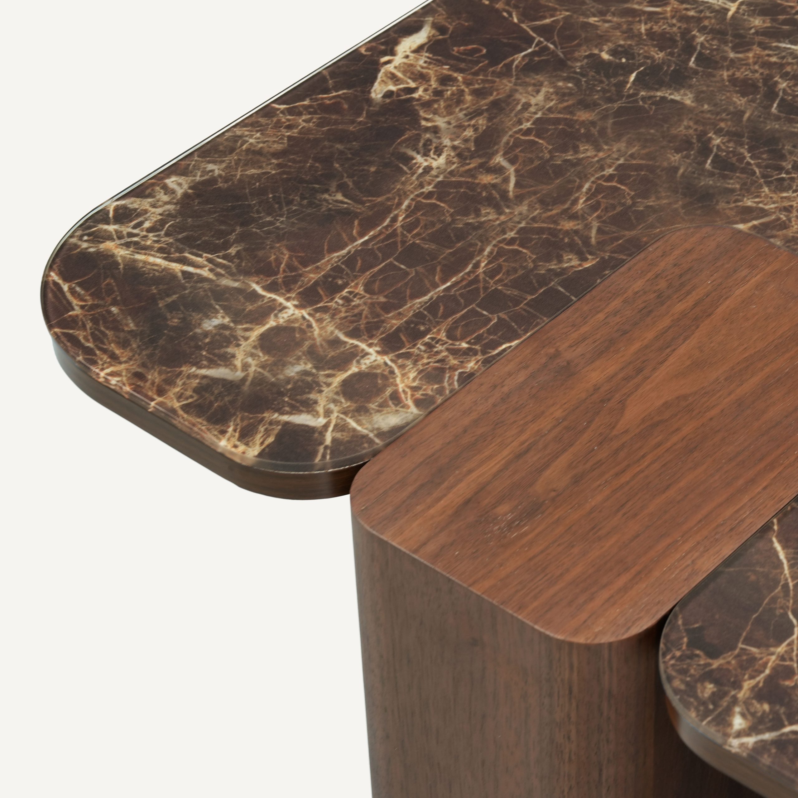 The Trend coffee table combines a tempered glass top with integrated wood accents and rounded Walnut wood legs, creating a striking contrast of stone and wood. Its asymmetrical design, low profile, and curve edges give a modern, luxurious feel for any contemporary space.