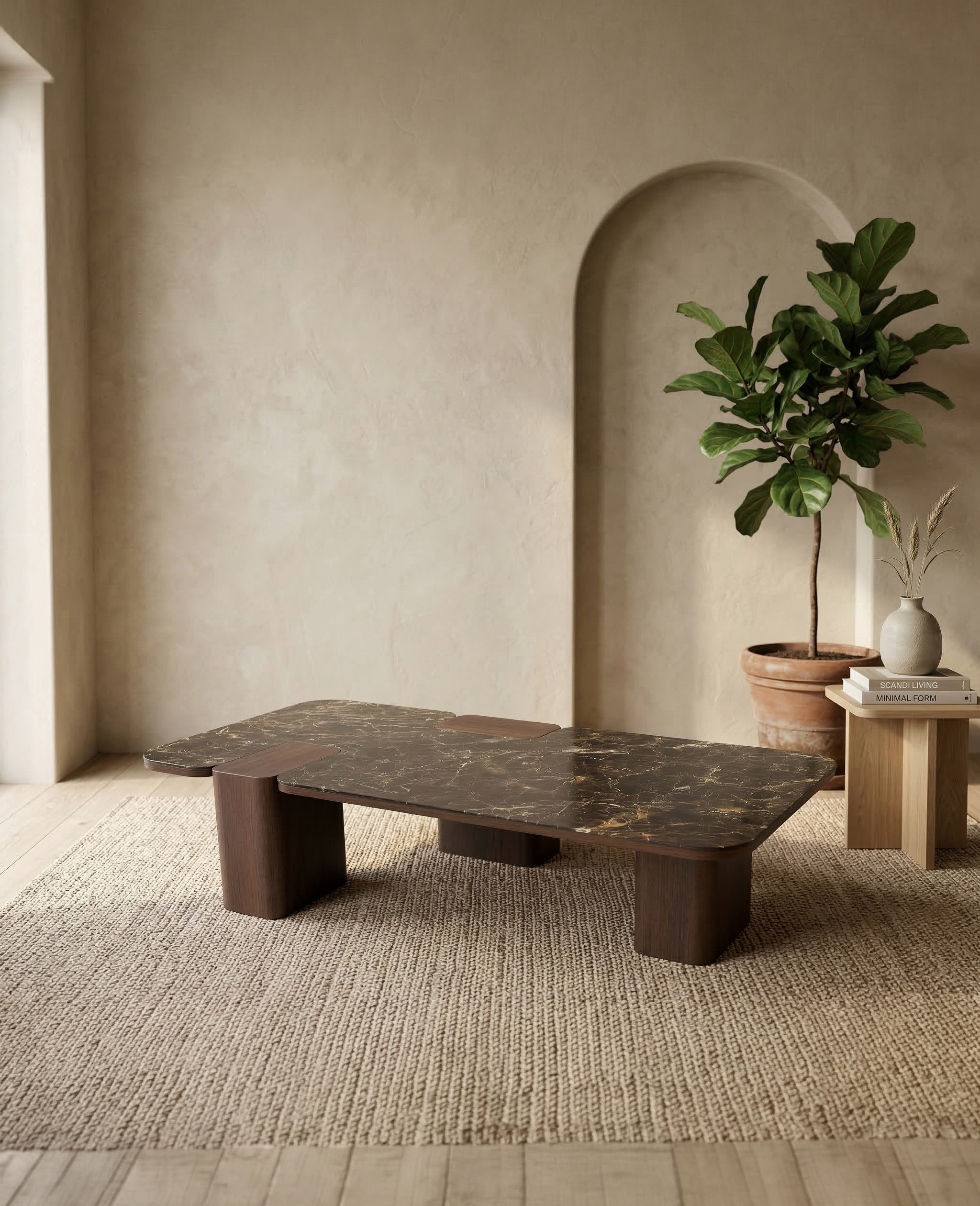 The Darius Coffee Table Set is a stunning embodiment of organic modern design, featuring a sculptural silhouette that effortlessly blends robust stability with refined elegance. This nesting duo is defined by its substantial, tapered pedestal bases crafted from rich, dark-stained walnut wood, which anchors the space with a sense of warmth and earthiness. The tabletops break away from rigid geometry, adopting a soft, pebble-like triangular shape with smooth, rounded edges that are both visually soothing and practical for high-traffic living areas. The true highlight of the design is the exquisite mixed-material surface: a thick, beveled wooden rim frames a luxurious central insert of light cream travertine or sintered stone. This contrast between the deep, organic wood grain and the cool, matte stone creates a sophisticated tactile experience, making the table not just a functional surface, but a captivating centerpiece perfect for Japandi, minimalist, or contemporary interiors.