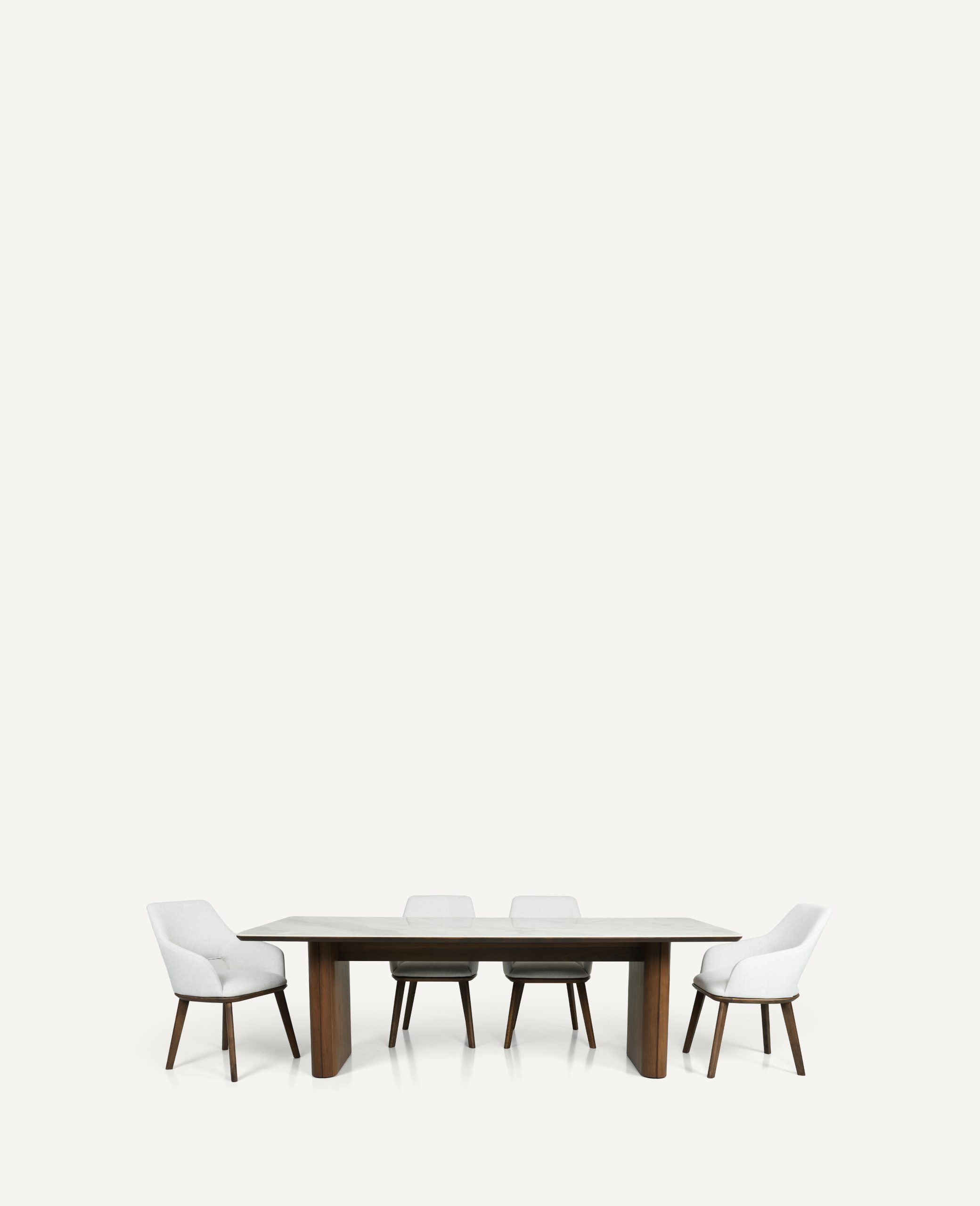 Venatino and Veleno dining collection form a harmonious pair, blending classic comfort with the Organic Modern aesthetic through refined fabric, natural stone, and warm architectural wood elements.