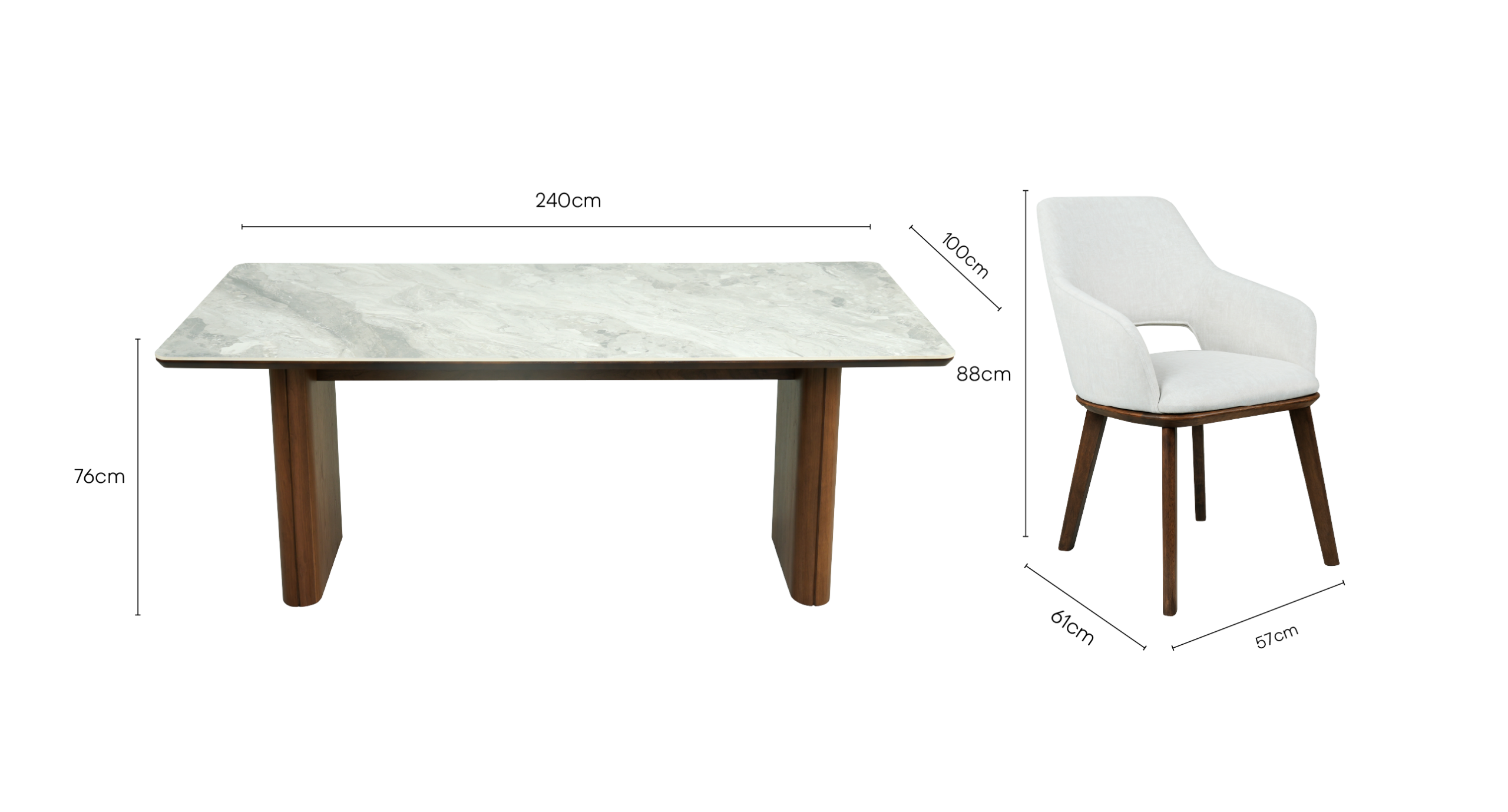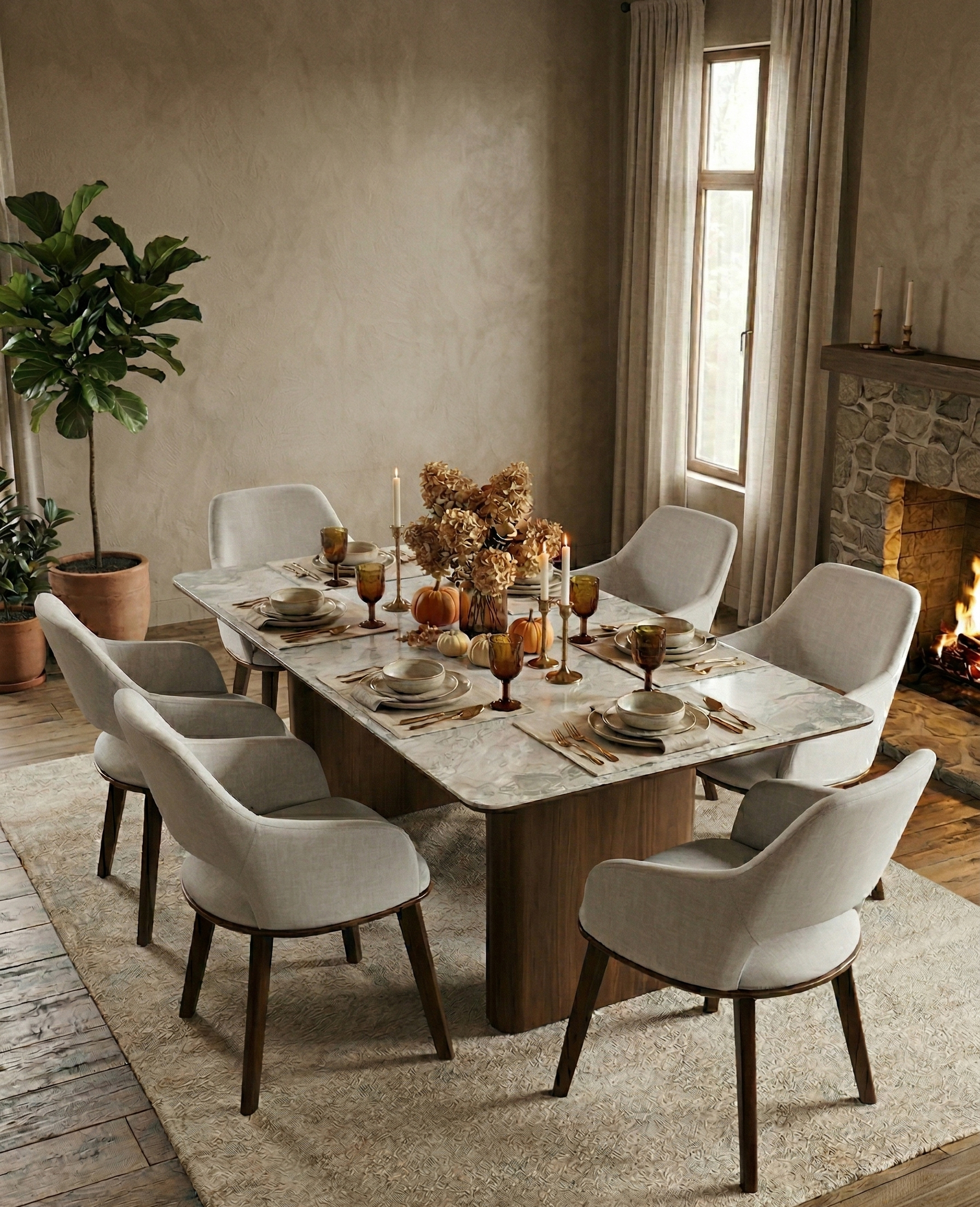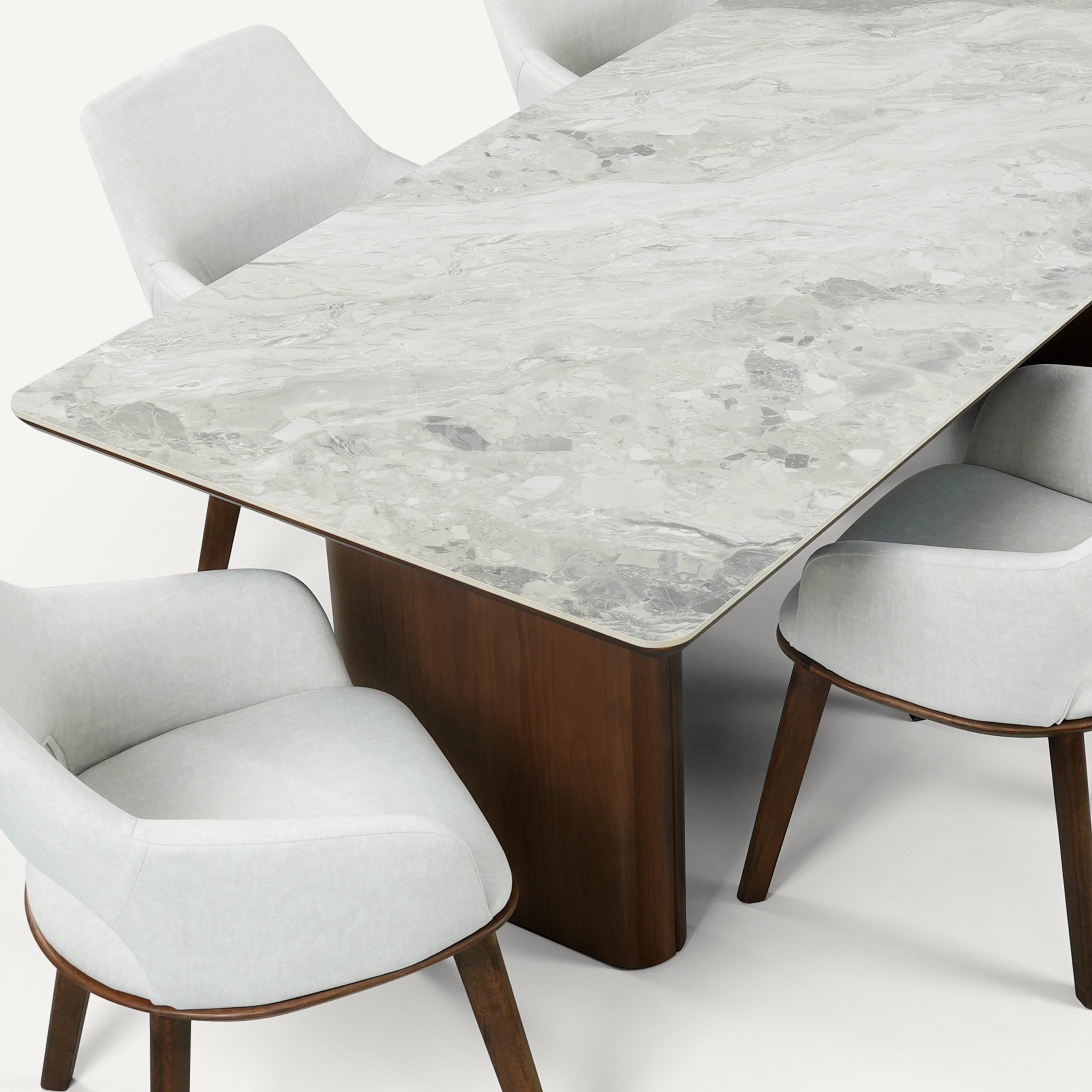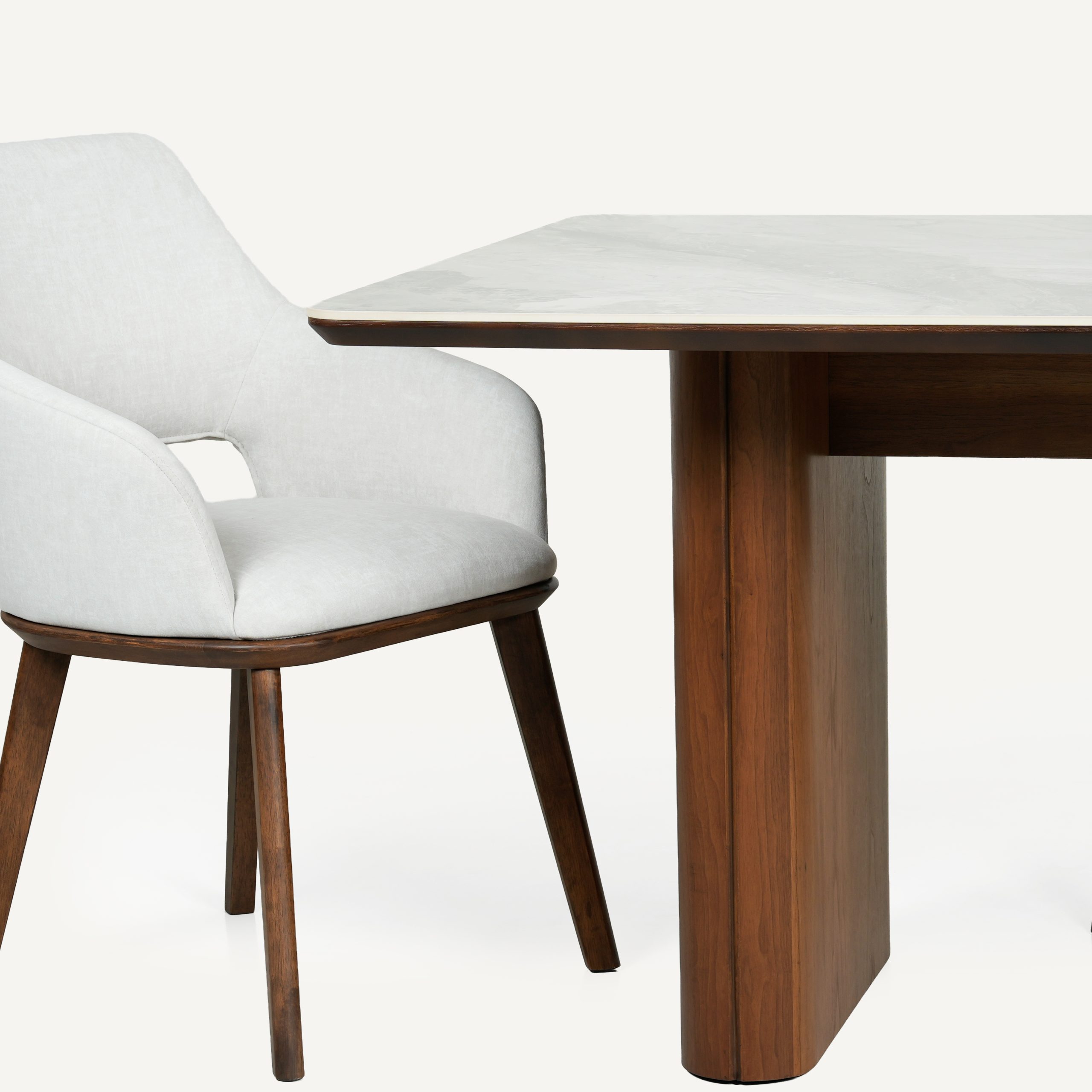 Weekend vibes feel even better when you’re surrounded by loved ones at home, and the Sinoti table sets the perfect scene with its ultra-strong, heat-resistant sintered stone top—highly scratch-proof, stain-resistant, and built to withstand daily use. Supported by a durable walnut veneer base that brings natural warmth and lasting stability, it becomes the ideal spot for family bonding, mealtimes, chitchat, and shared laughter. Paired seamlessly with the Alette Chairs, upholstered in easy-clean, OEKO-TEX® certified fabric, this ensemble embodies understated elegance, transforming your dining area into a refined haven for both casual meals and grand celebrations.