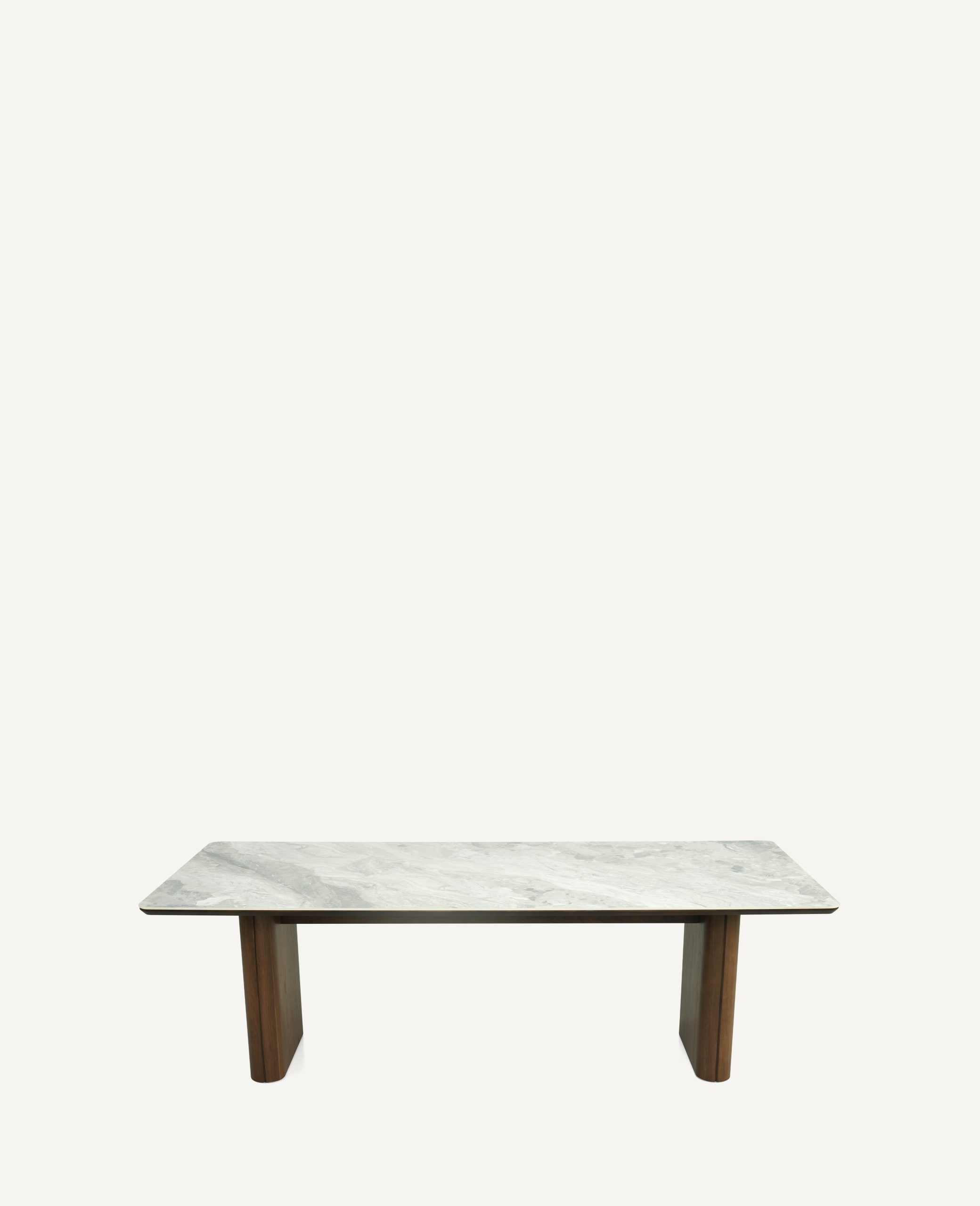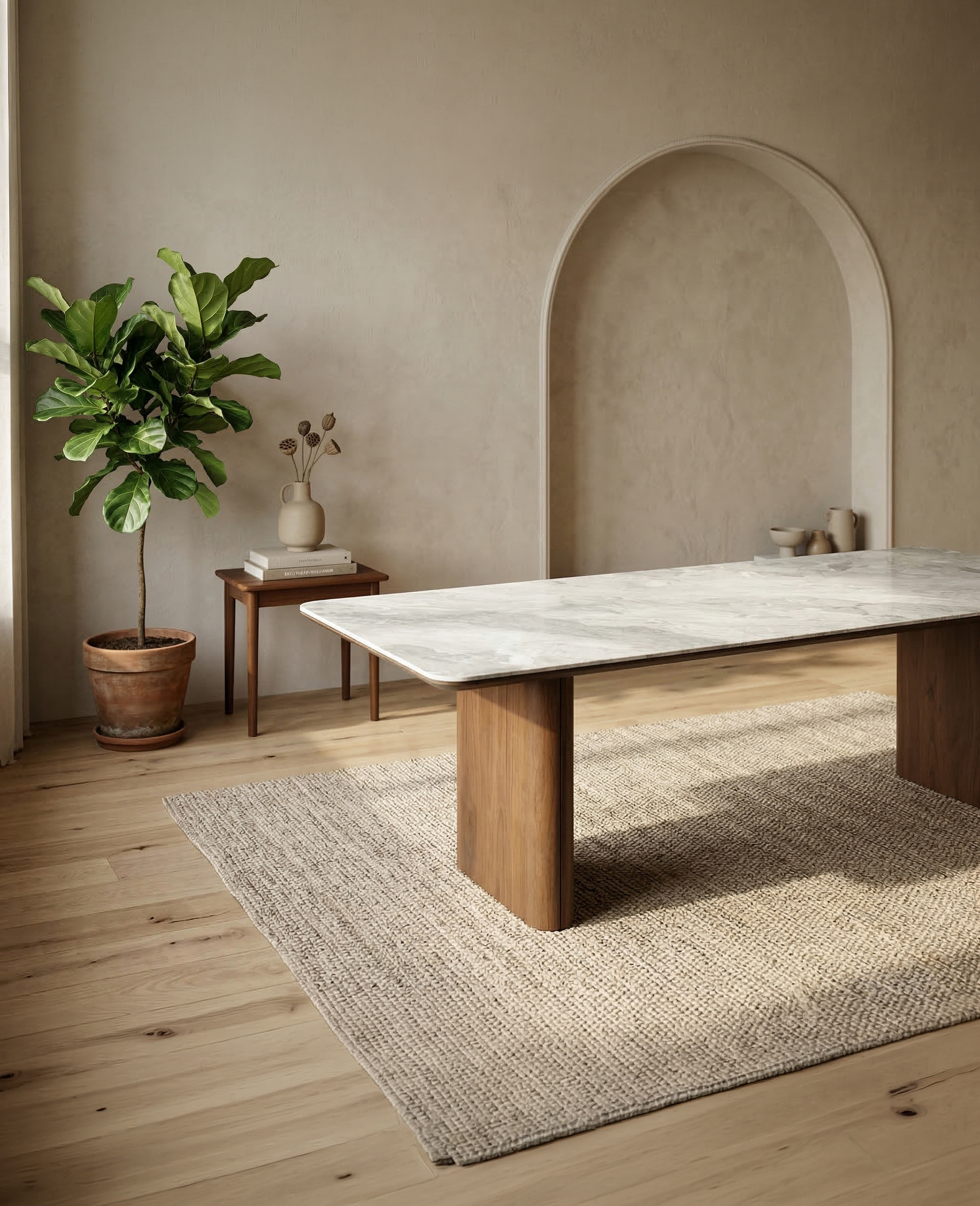 Venatino is a sophisticated dining table that exemplifies the “Organic Modern” aesthetic, balancing the weight of natural stone with the warmth of architectural woodwork.